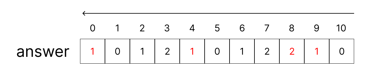 - 문자열의 현재 위치 문자가 입력받은 문자와 같다면 변수 p를 0으로 둔다. (p 값을 answer의 현재 인덱스 위치에 저장하지 않는 이유는 이미 왼쪽부터 탐색할 때 0을 넣었기 때문이다.)