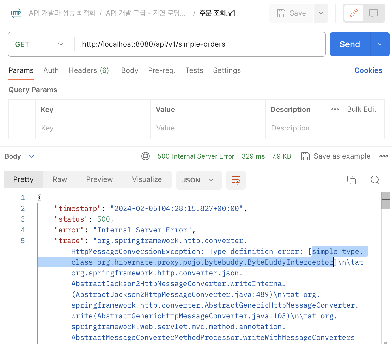 Order의 member는 fetch가 LAZY로 설정되어 있다. 즉, 지연로딩이다. 지연로딩은 데이터를 DB에서 가져오는 것이 아니다. Hibernate는 가짜 ProxyMember 객체를 생성하여 넣어놓은 것이다. Jackson 라이브러리가 member를 조회하려고 하는데 Member가 객체가 아니라서 처리가 불가능해 에러가 발생한 것이다.