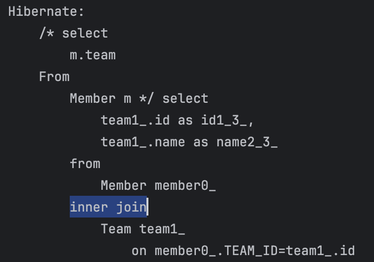 다음과 같다. 객체 입장에서는 단순히 .을 찍는 것이지만 실제 나가는 쿼리에는 inner join이 포함되어 있다.