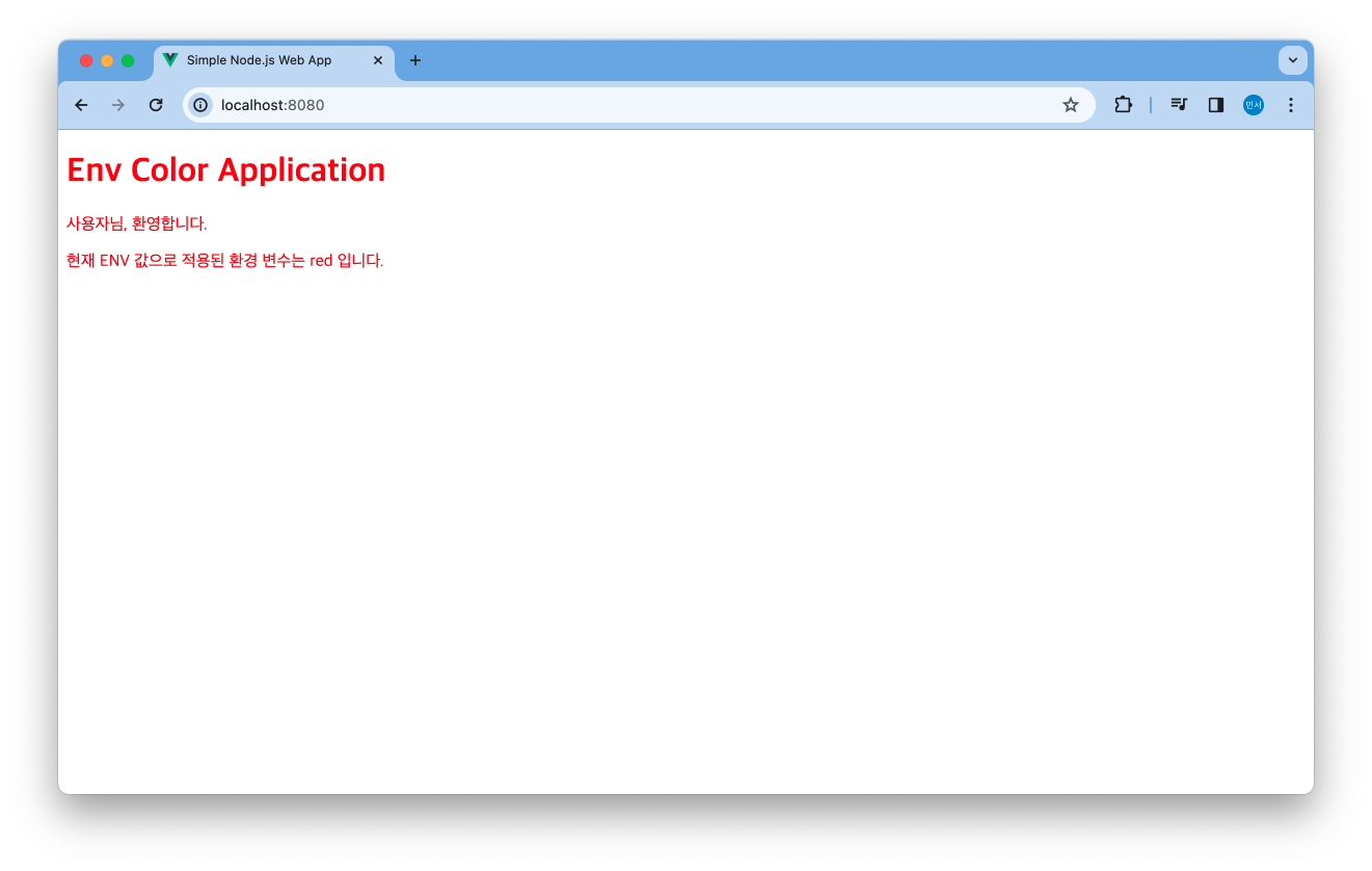 실습에 사용될 envnodecolorapp 어플리케이션은 사용자에게 특정 색상의 웹 페이지를 응답해준다. 컨테이너를 실행할 때 어떤 설정을 하느냐에 따라 다른 색의 글씨를 출력한다.