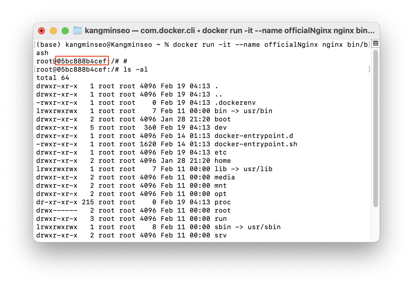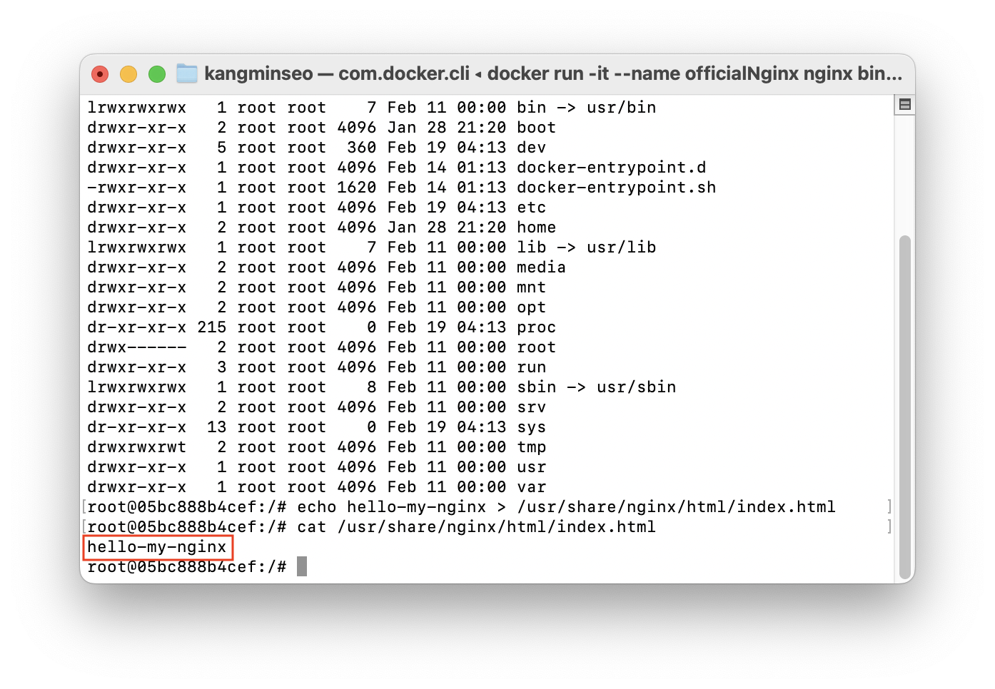 (터미널1) nginx 이미지을 실행함과 동시에 Bash에 접근할 수 있다.