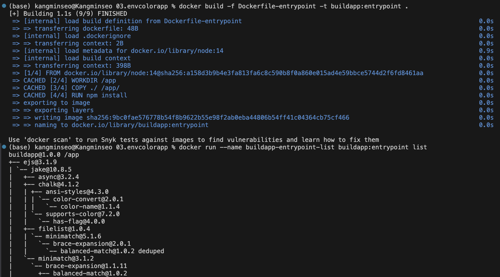 다음 명령어는 buildapp:entrypoint 이미지의 CMD를 /bin/bash로 덮어씌우며 컨테이너로 실행한다. ENTRYPOINT에 npm 명령어가 있기 때문에 실제로 실행되는 명령어는 npm bin/bash 로, 잘못된 명령어가 실행된다.