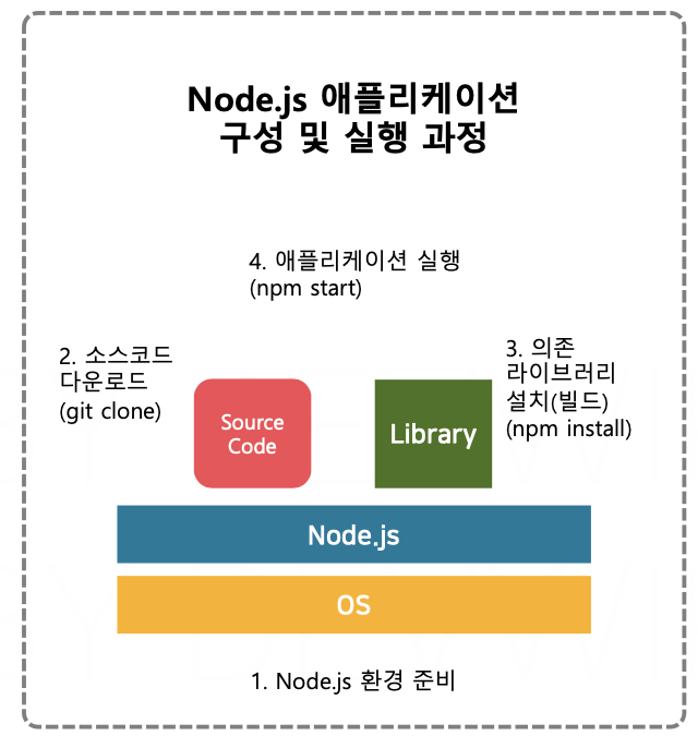 Node.js가 설치되어 있는 OS 환경을 준비하고, Node.js 로 개발된 소스코드가 필요하다. 소스코드를 애플리케이션으로 빌드(여기에서의 빌드는 이미지의 빌드가 아니라 애플리케이션의 빌드이다.)해야 하고, 그 과정에서 애플리케이션을 실행할 때 필요한 라이브러리가 존재해야 한다. 소스코드가 있는 디렉토리에서 npm install을 하면 애플리케이션이 실행되기 위한 의존성 라이브러리가 설치된다. npm start 를 하면 애플리케이션을 실행한다.