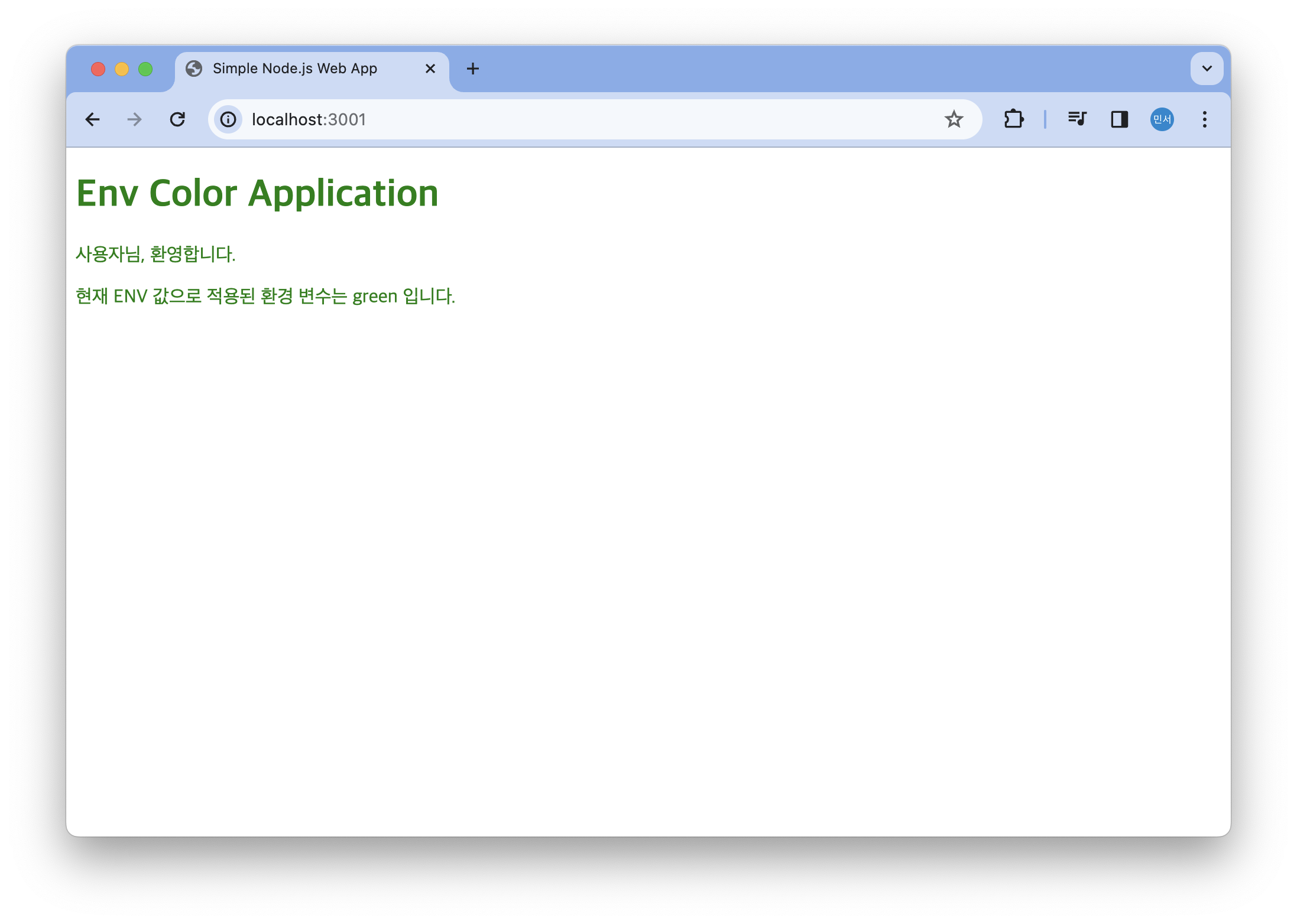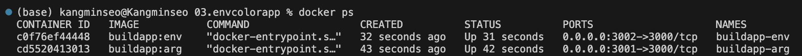 localhost:3001 (ARG 사용)로 접속하면 기본색인 GREEN으로 적용된 것을 볼 수 있다. ARG 값으로 RED를 지정했지만, ARG는 컨테이너로 실행할 때는 적용되지 않기 때문에 애플리케이션 기본 값인 GREEN 으로 적용되었다.