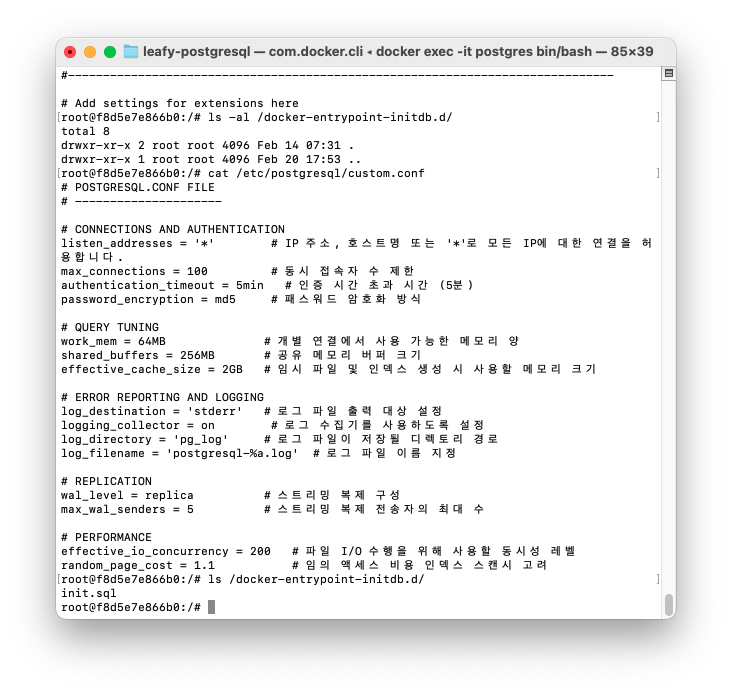 (터미널2) 호스트 머신의 conf 파일을 postgres 컨테이너로 복사한다.