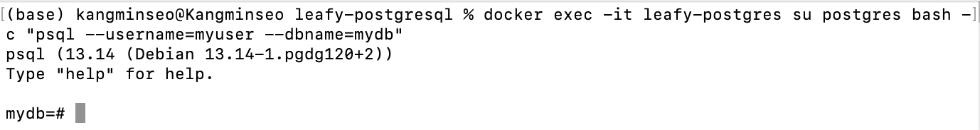 leafy-postgres 컨테이너 내에서 명령어 실행 후 결과를 출력한다. postgres의 터미널로 접근이 가능하다.