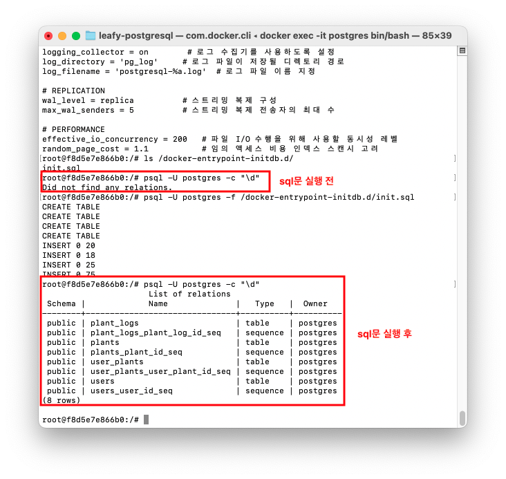 leafy-postgres 컨테이너의 로그를 확인한다.