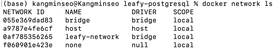 leafy-network가 생성되어 있는지 확인한다. leafy-network가 없다면 docker network create leafy-network 로 컨테이너 구성에 사용될 네트워크를 생성한다.
