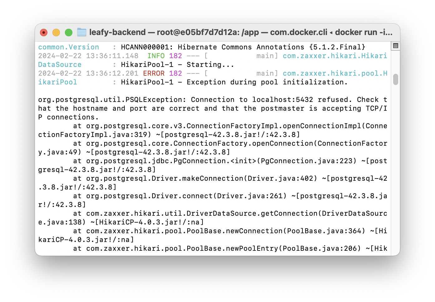 leafy 컨테이너의 로그를 확인한다. (leafy-postgres가 실행되어 있어야 한다.)