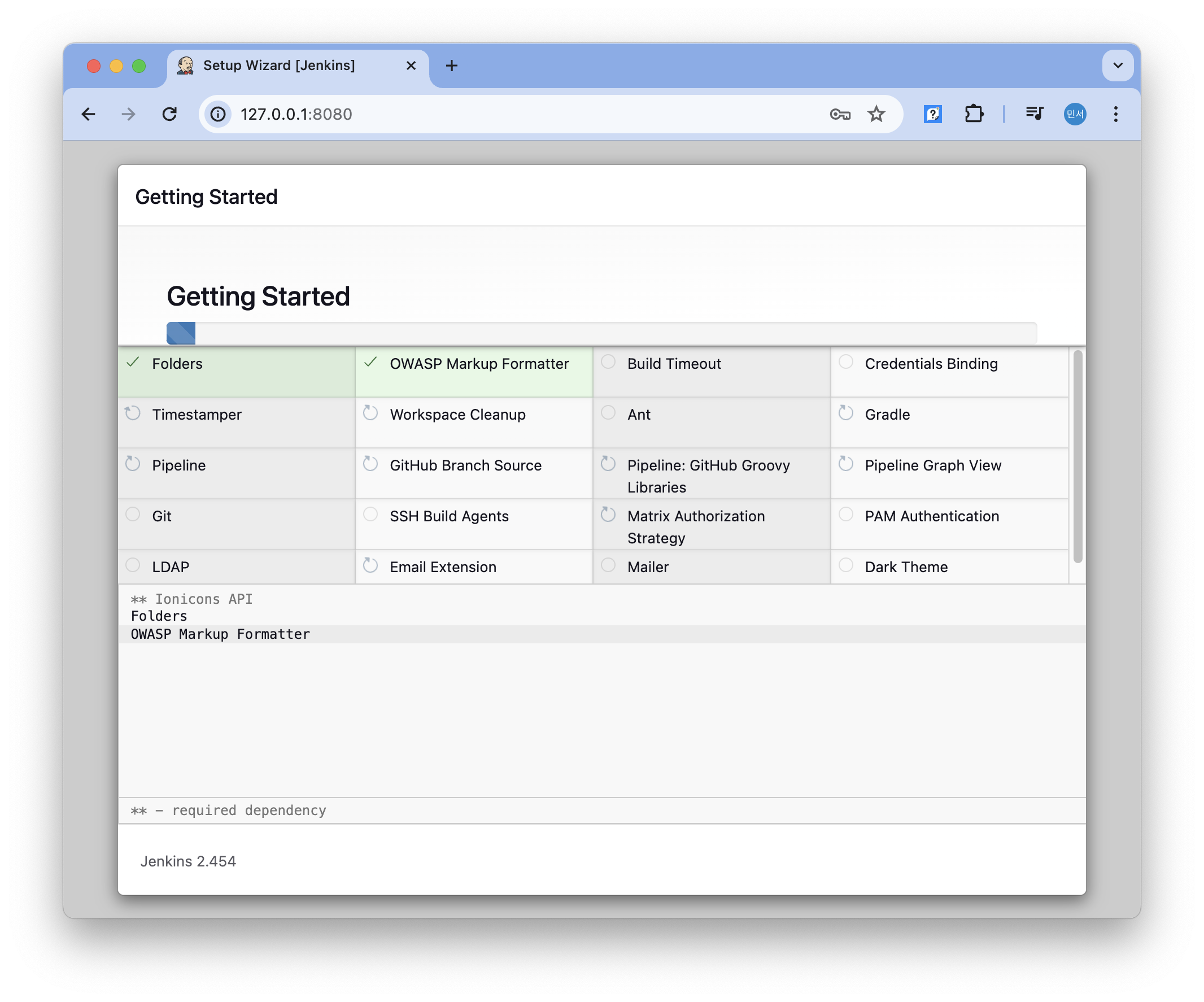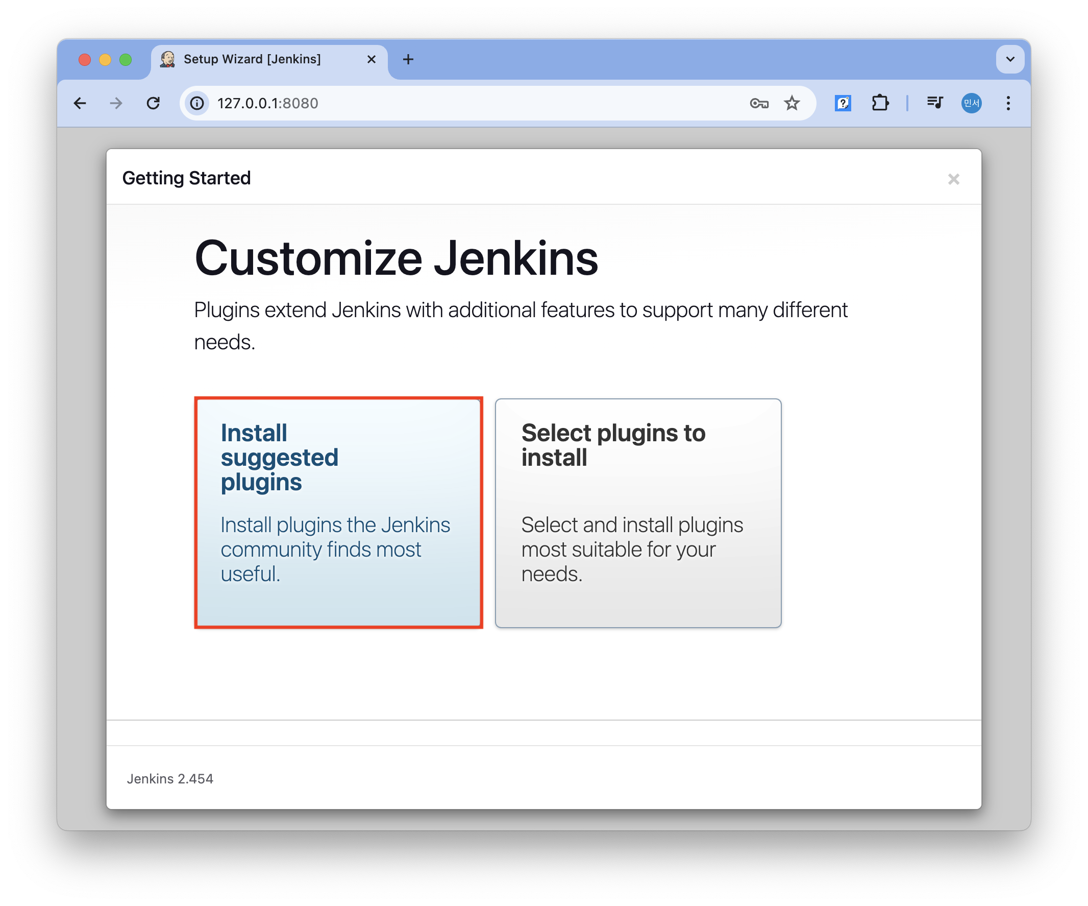 install suggested plugins를 선택했다. 설치가 완료되는데 시간이 조금 걸렸다.