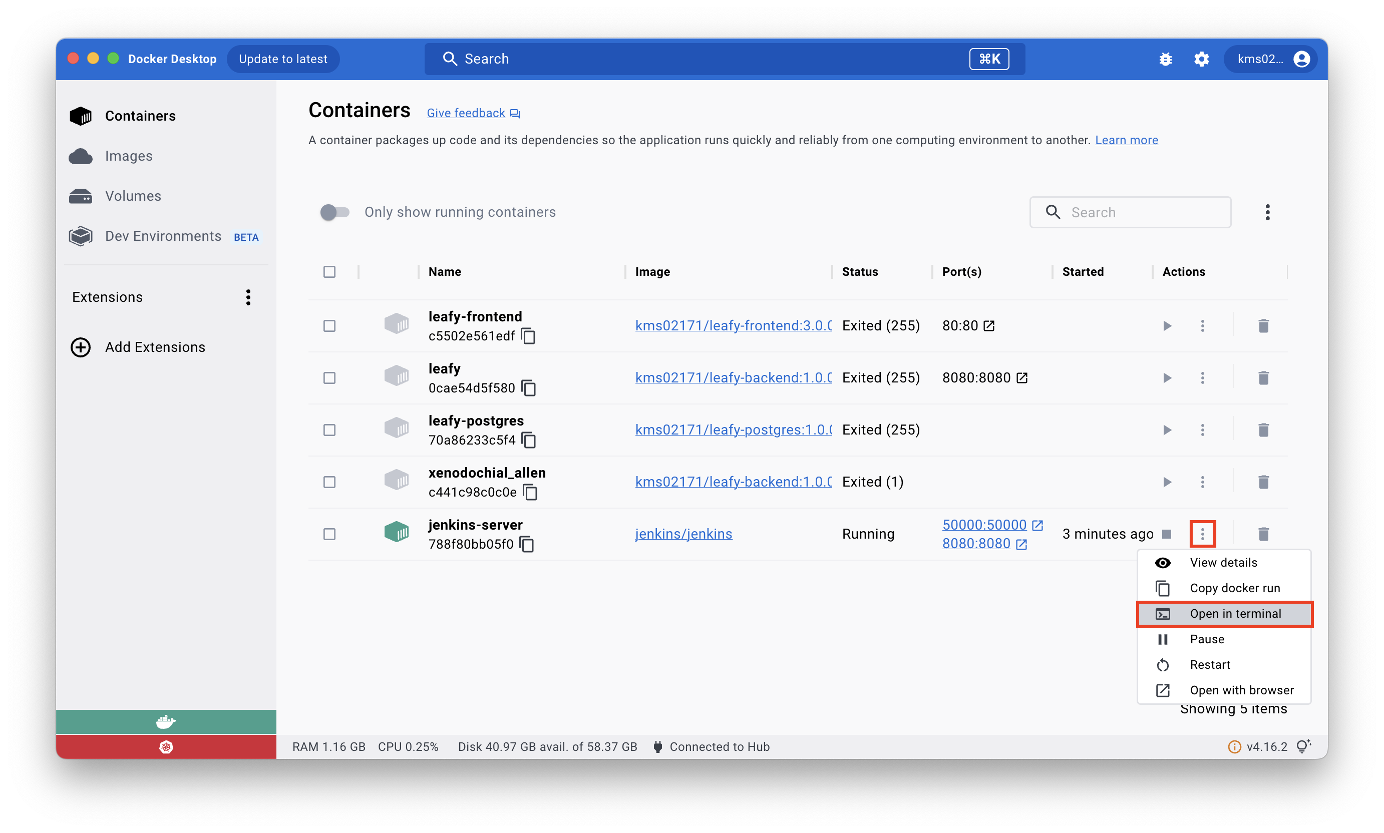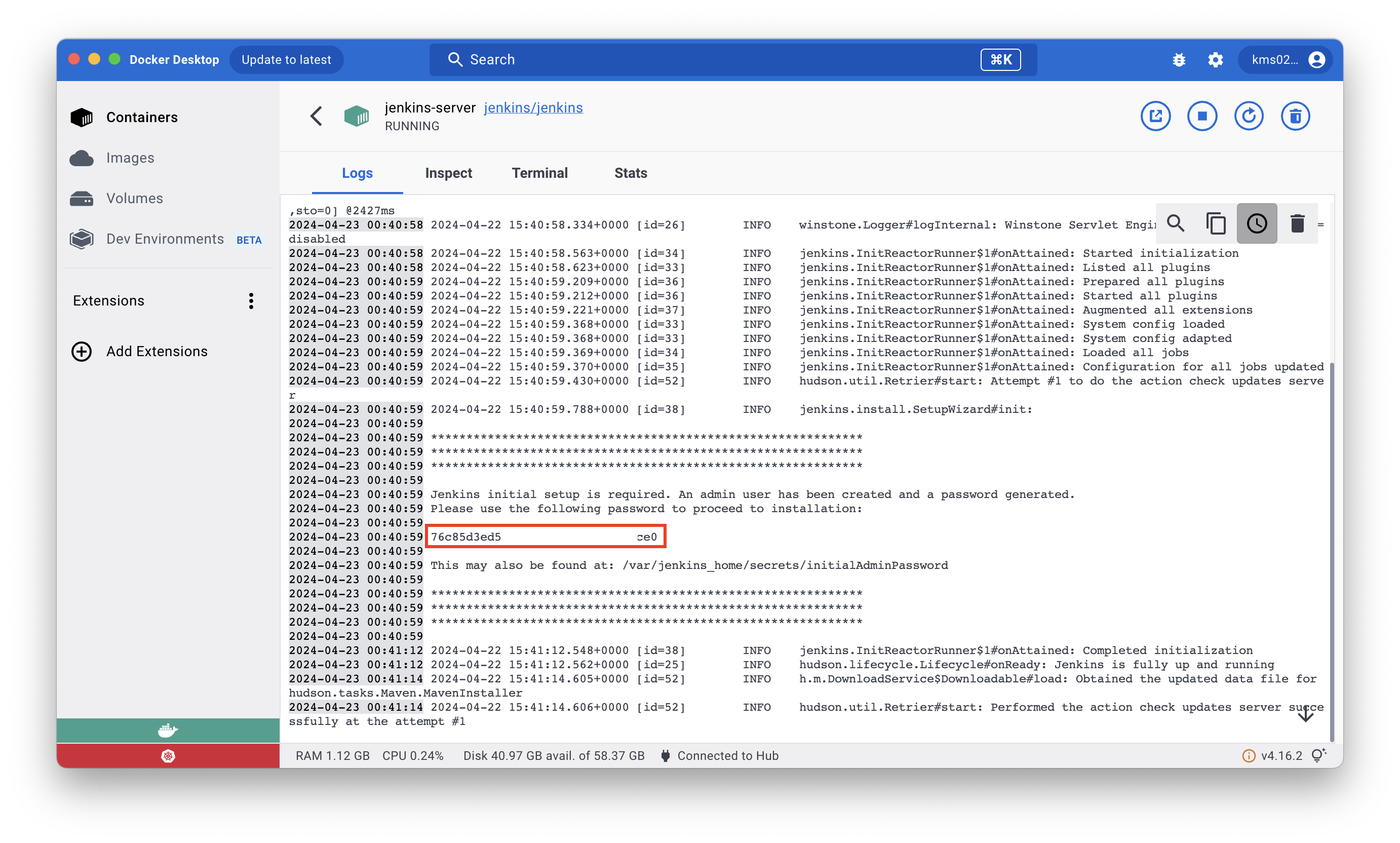 docker desktop에서 jenkeins에 ... 을 눌러서 open in terminal을 하면 jenkins가 실행중인 내부 컨테이너 터미널로 들어올 수 있다. 아래와 같이 비밀번호를 볼 수 있고, 이것을 복붙하면 된다.