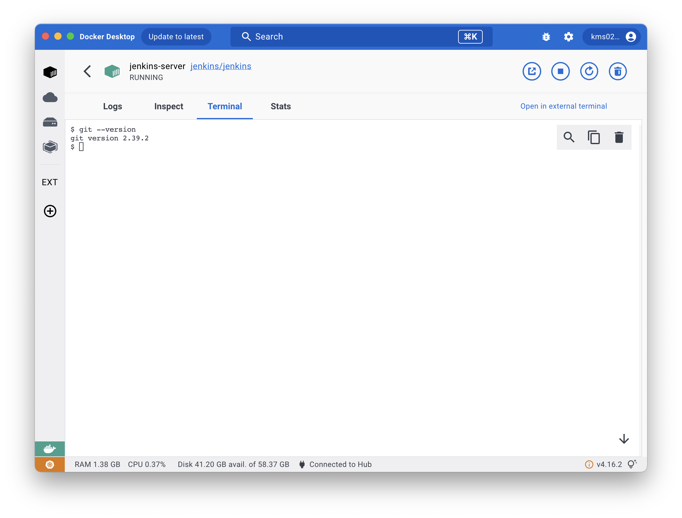 docker desktop에서 Jenkins 컨테이너 내부로 접속한 후 간단한 git 버전을 확인하는 명령어인 git --version을 입력하면 버전이 잘 나온다. git 명령어를 사용할 수 있음을 확인할 수 있다.
