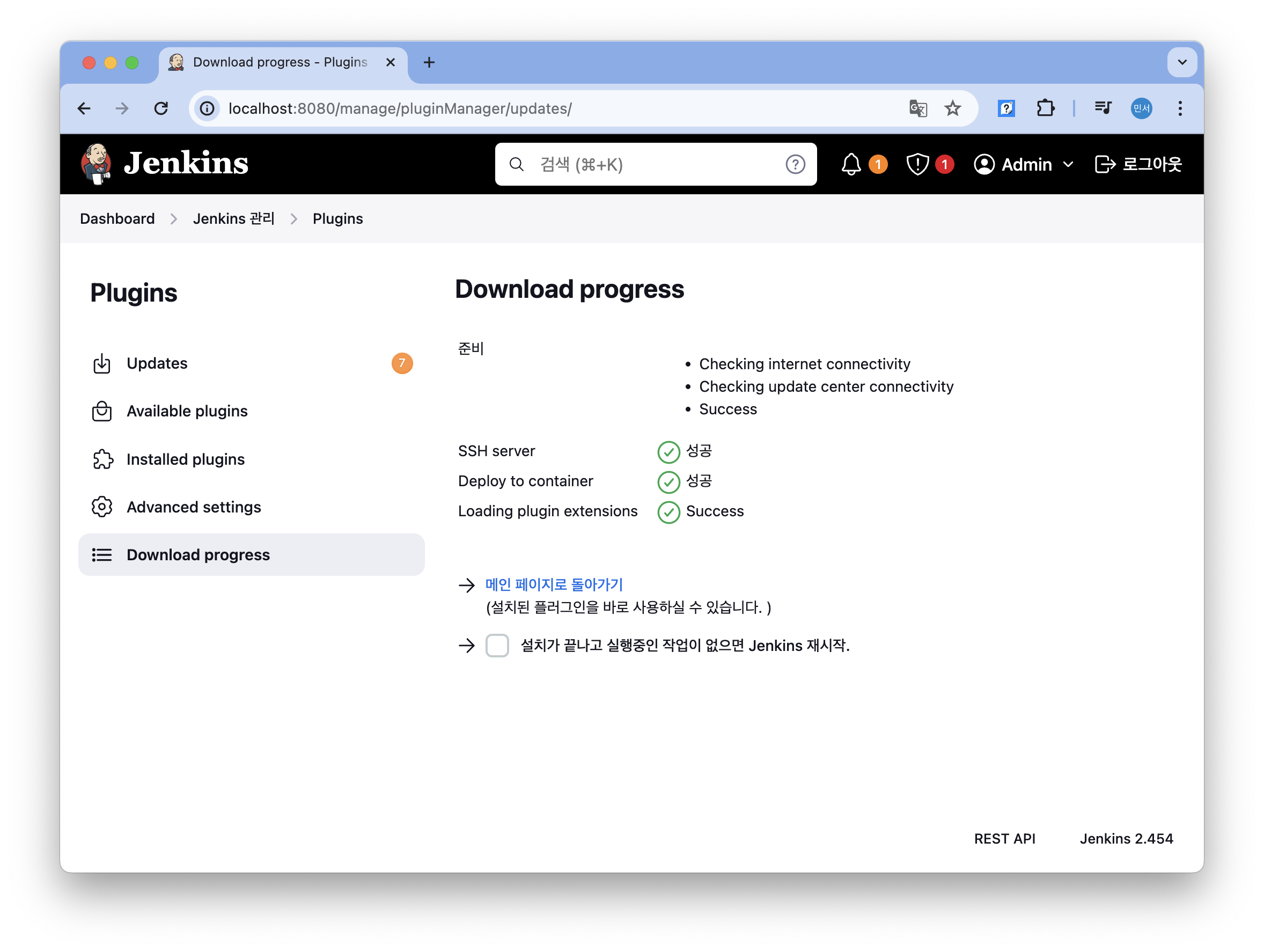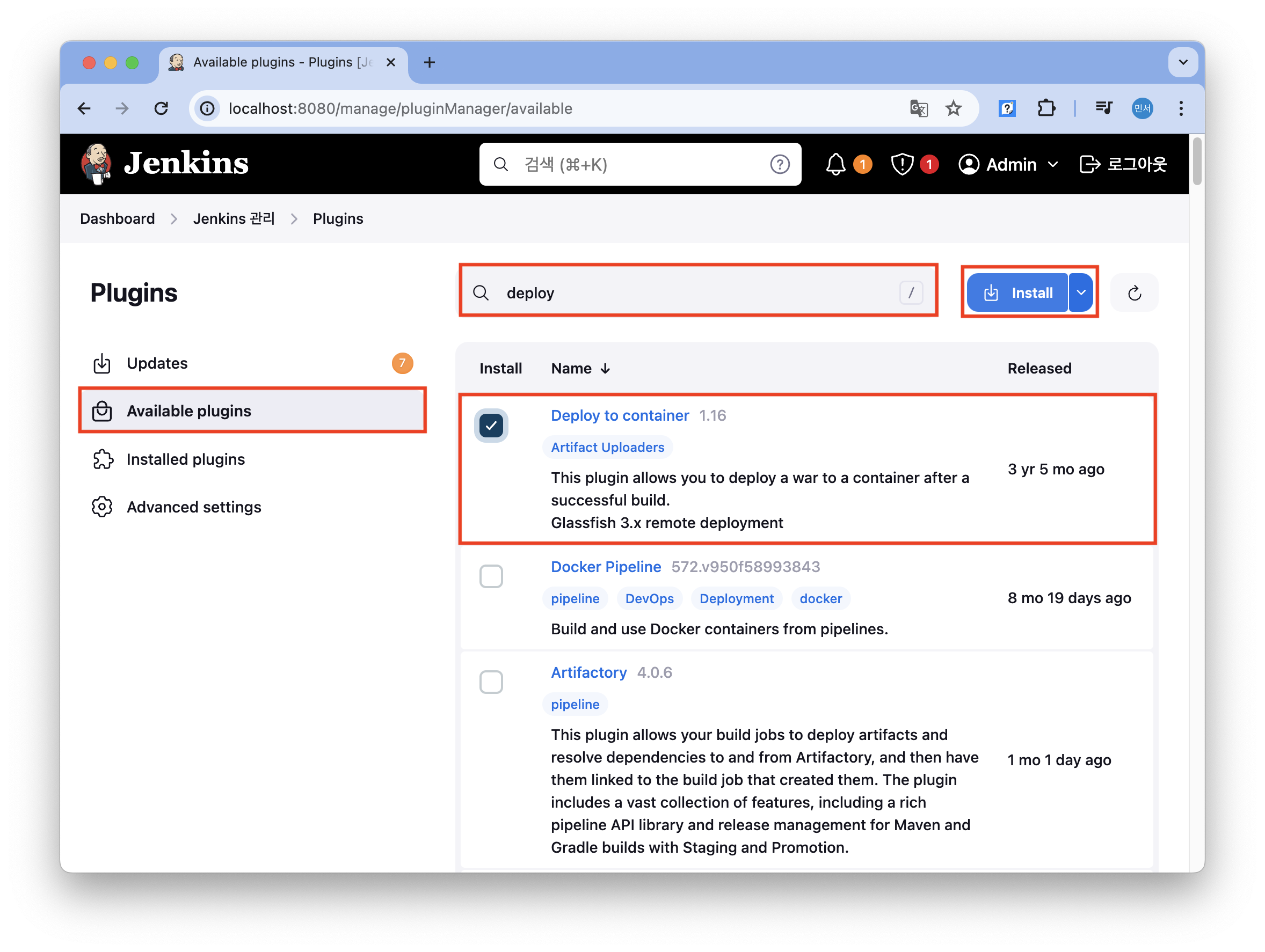 [Jenkins 관리] - [Plugins] - [available] 를 클릭하고 deploy 를 검색하고 deploy to container가 설치되어 있지 않다면 설치한다. 이 플러그인이 있어야 빌드한 war 파일을 복사해서 tomcat에 배포할 수 있다.