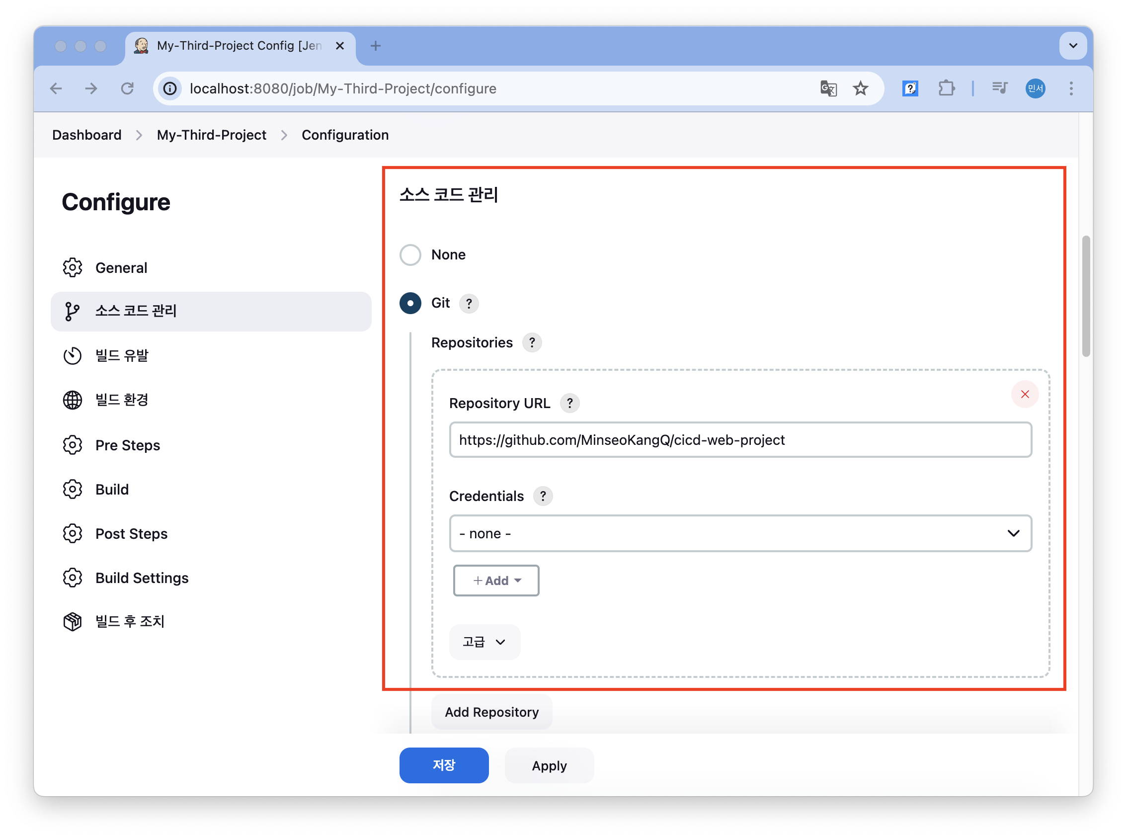 Item에 대한 간단한 설명을 작성했고, 소스코드 관리는 Git을 체크하고 링크를 작성했다. 작성한 링크의 repository는 public이라서 crendential은 추가하지 않았다.