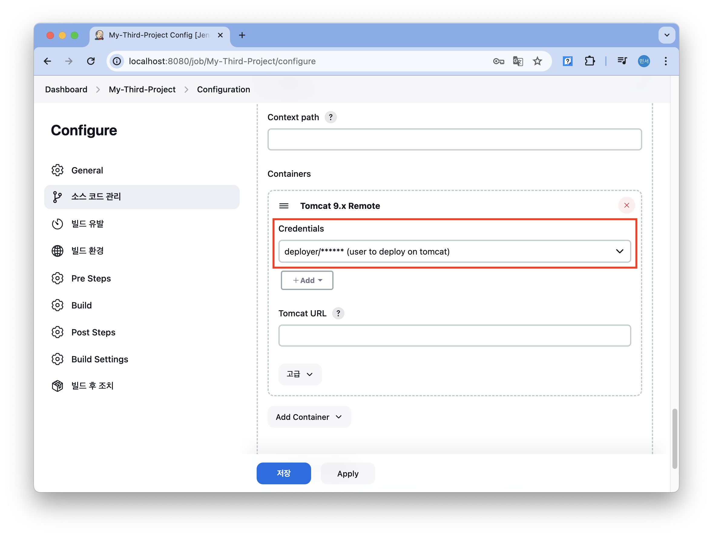 tomcat 서버에 배포할 수 있는 권한을 설정하기 위해 Credential을 추가한다.