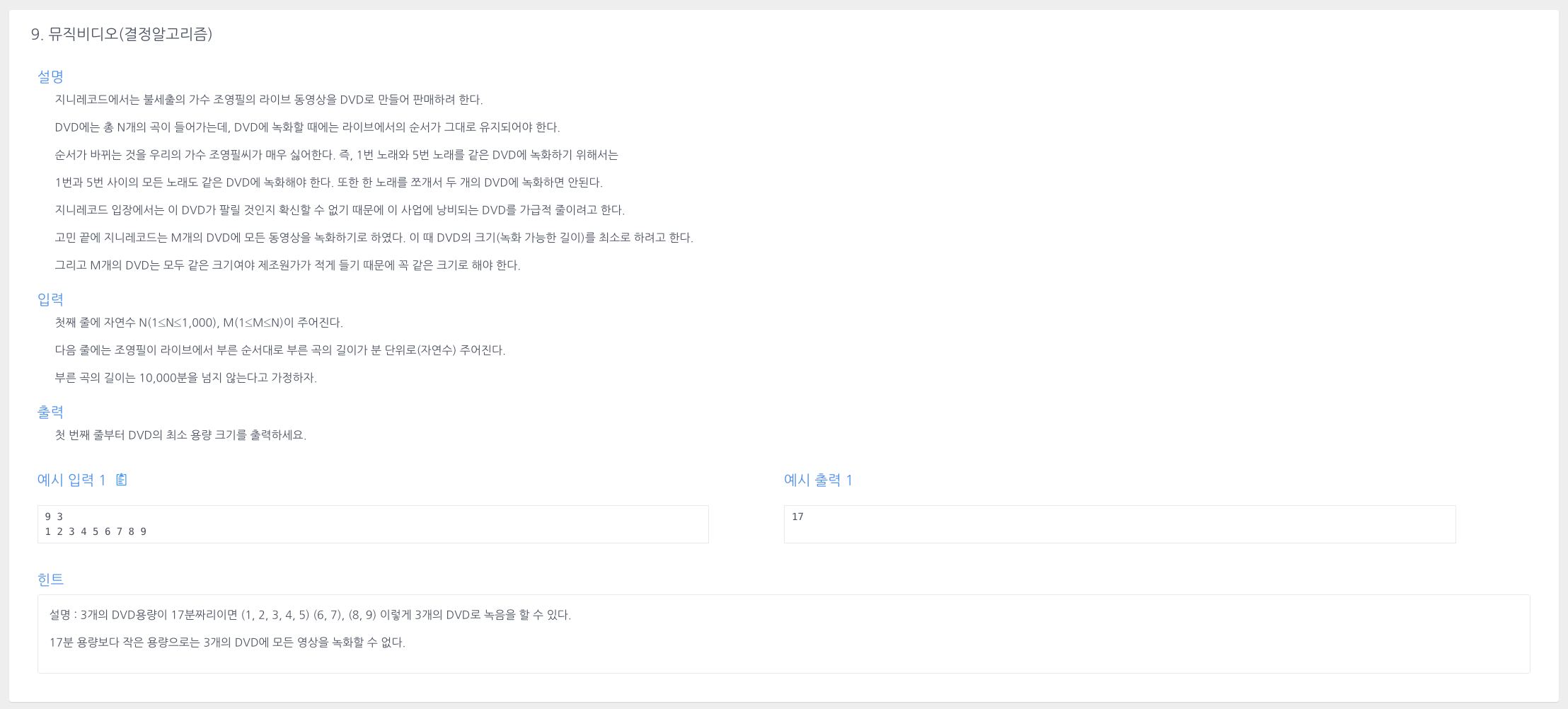 * DVD 한 장은 최소 9분이어야 함 -> 가장 긴 영상 길이가 9분