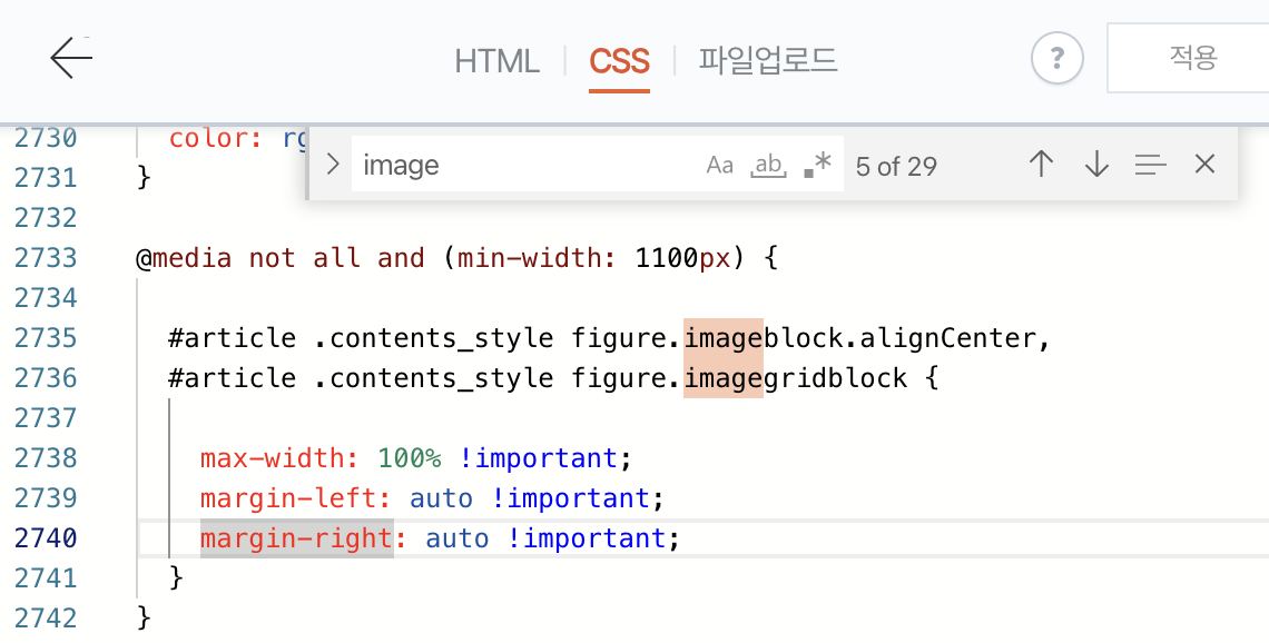 이를 해결하고자 스킨 편집에서 아래와 같이 (기존에 있던 코드는 삭제하고) max-width, margin-left, margin-right 부분을 추가했다.