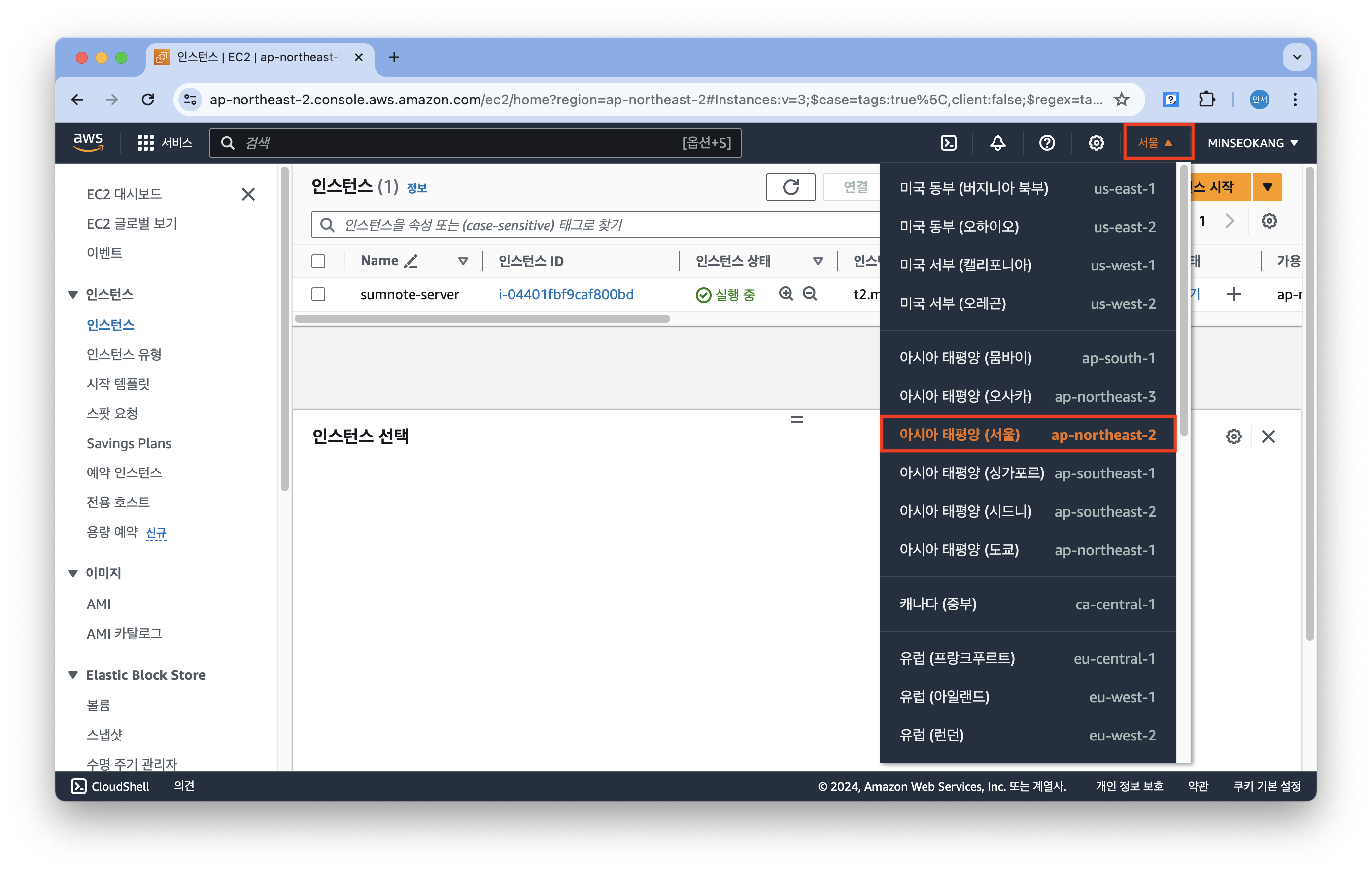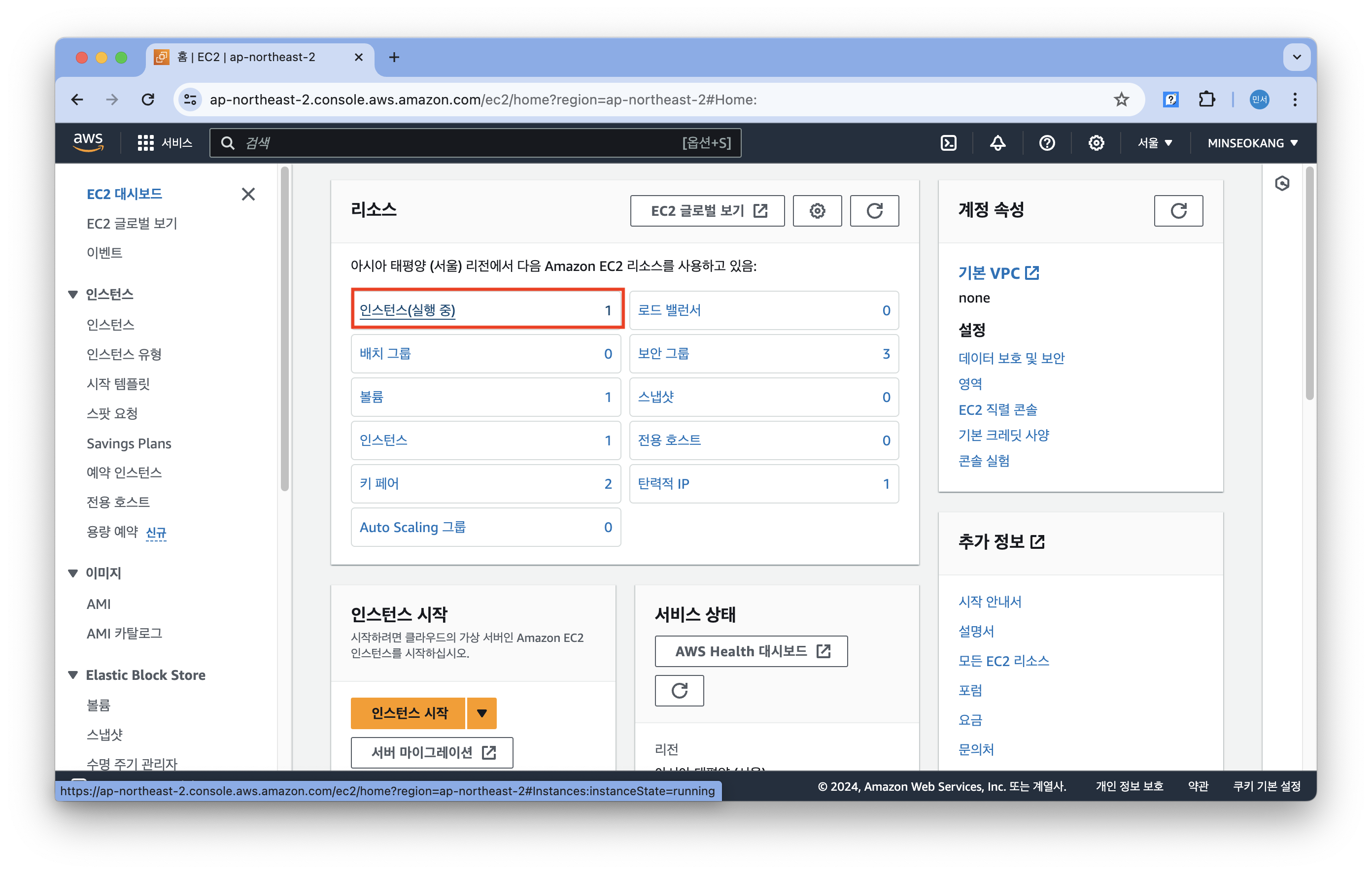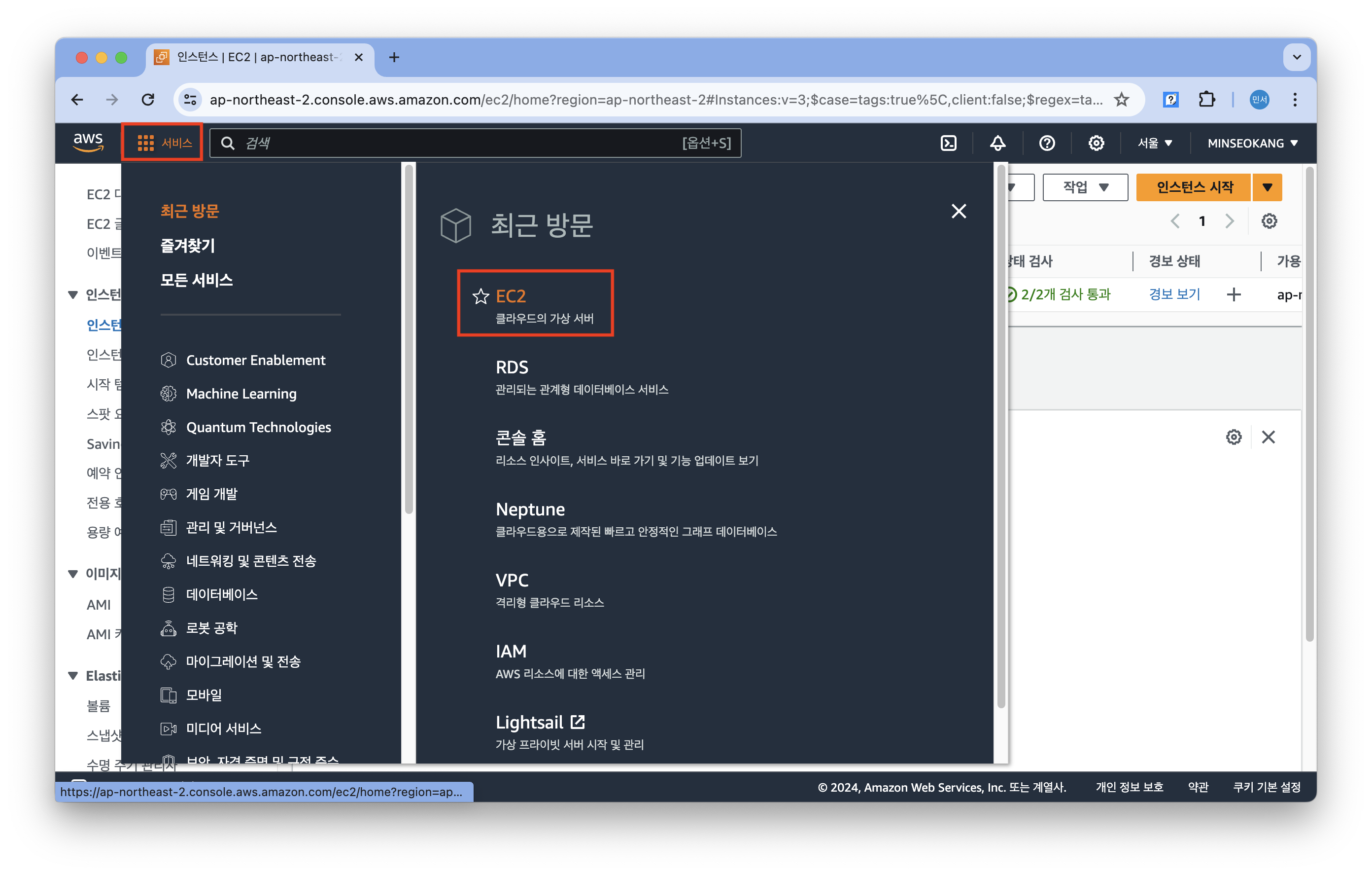 먼저 AWS로 접속하여 리전이 서울인지 확인한 후에 EC2 탭으로 들어간다.