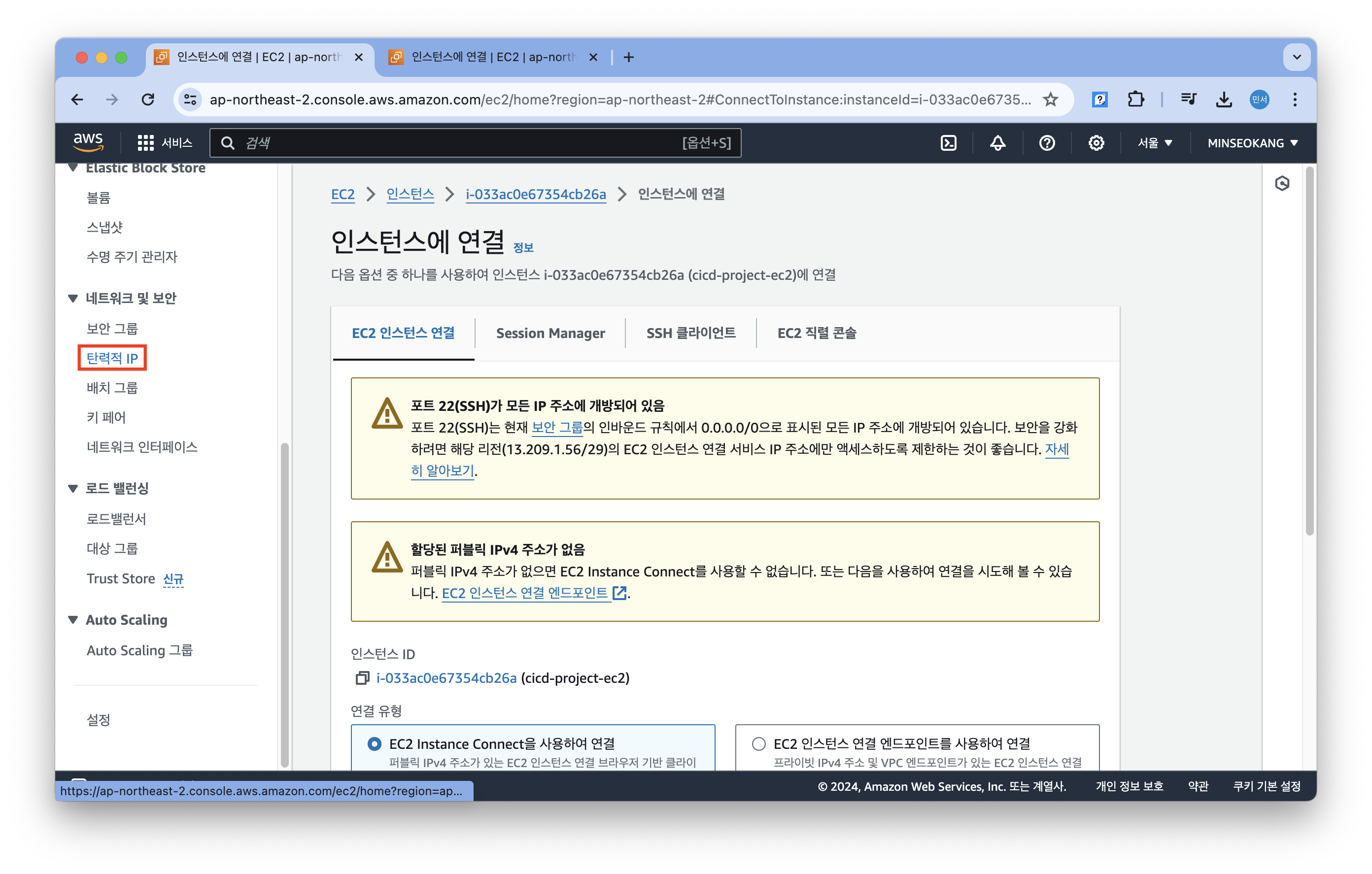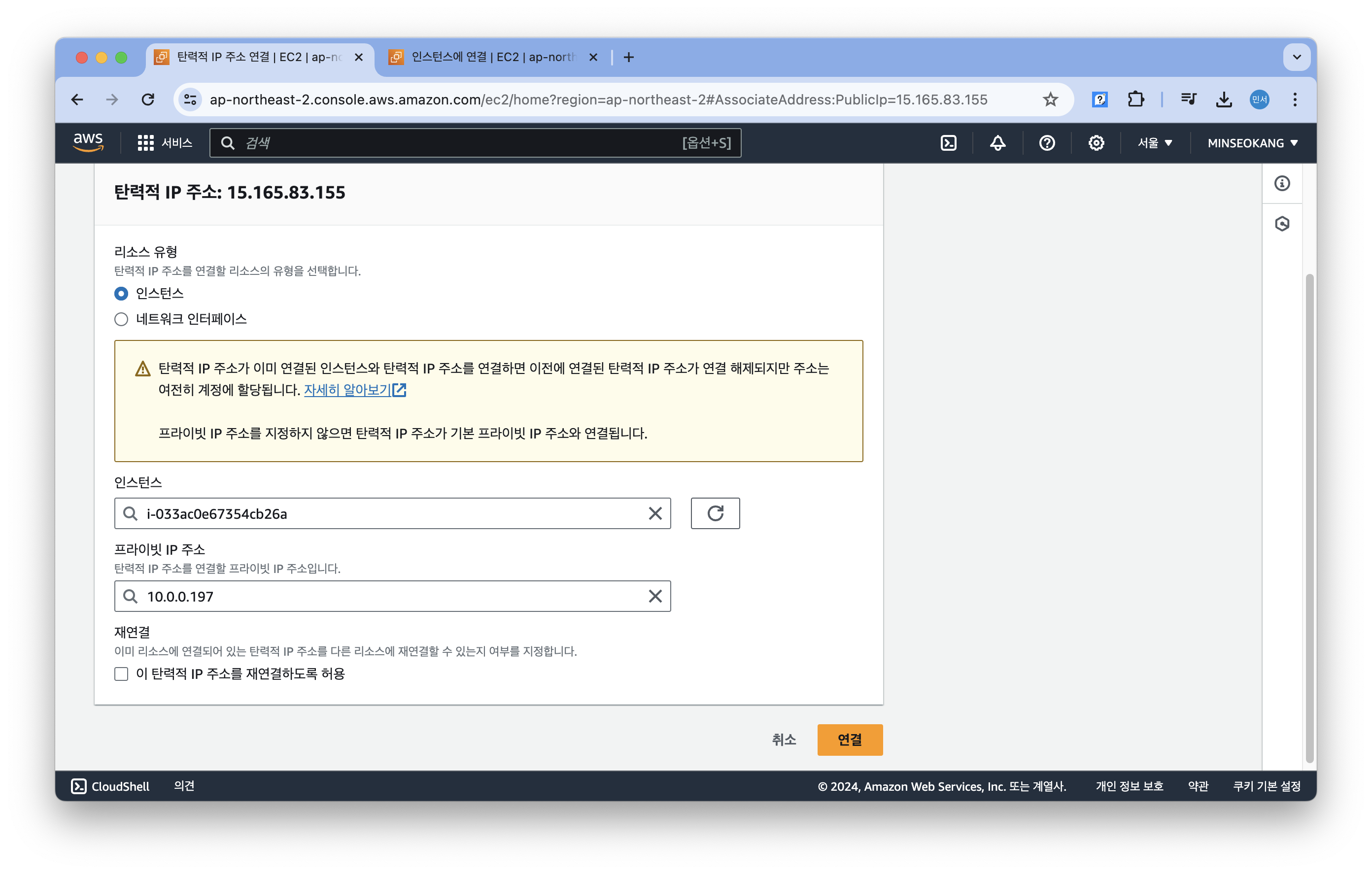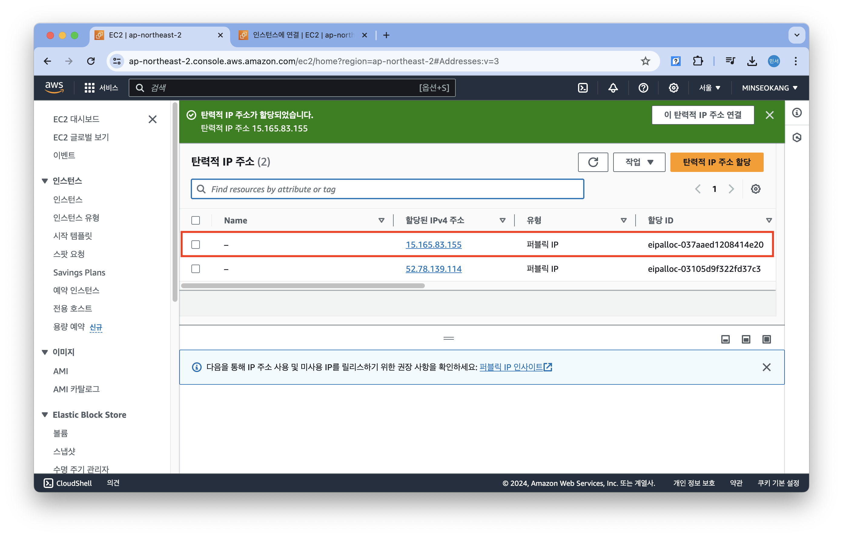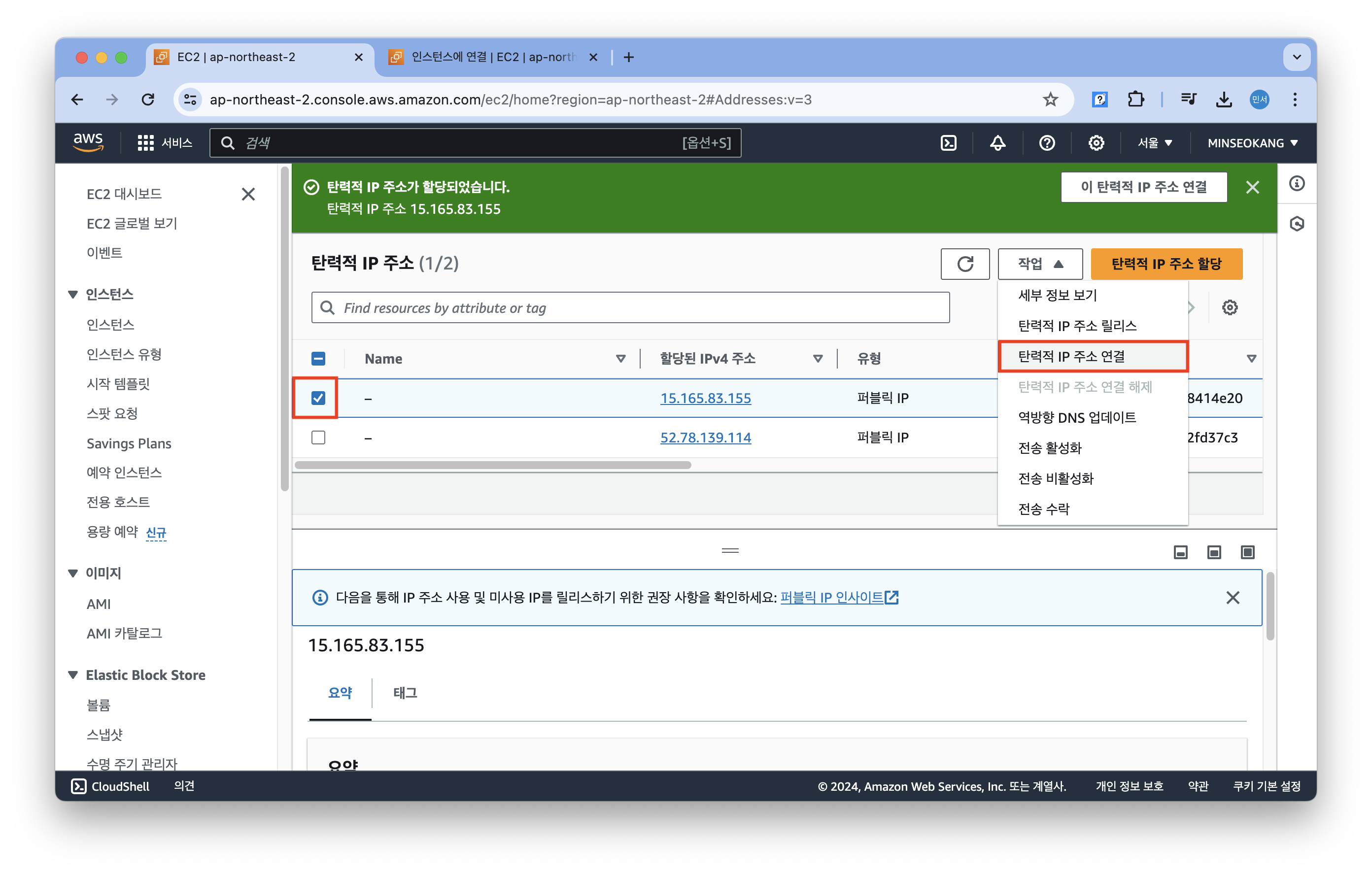 탄력적 IP 주소가 잘 할당이 된 것을 볼 수 있다.