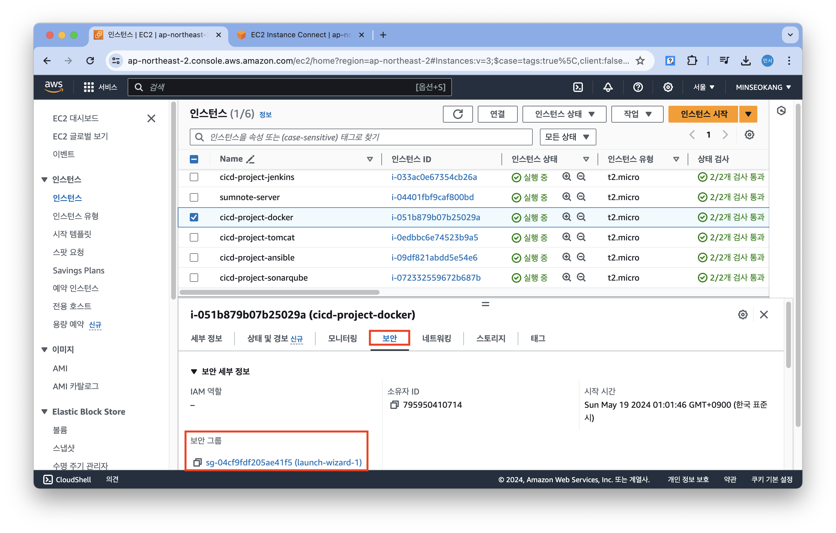 생성한 인스턴스를 클릭하여 연결된 보안그룹을 클릭한다.