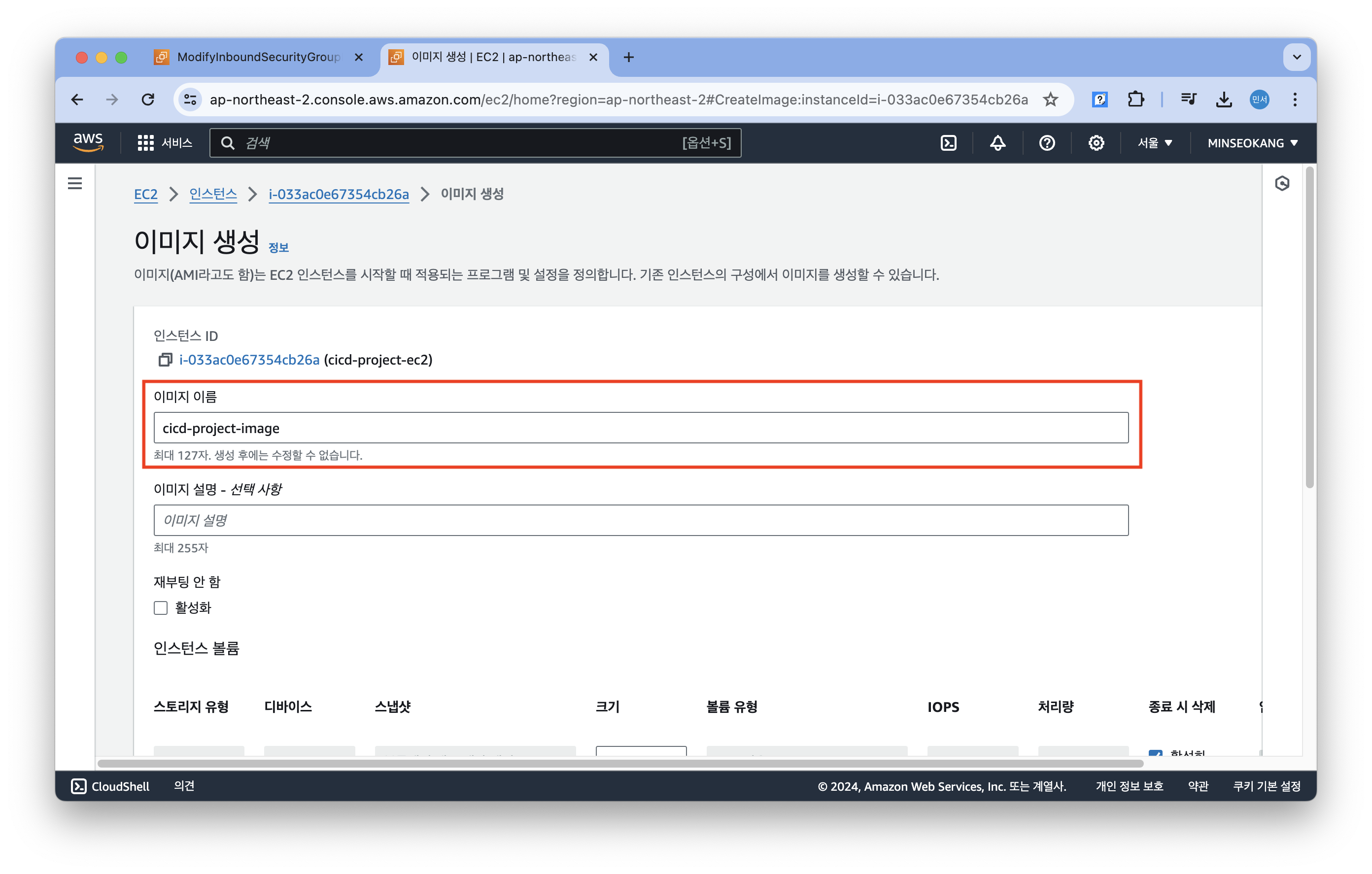 이미지 이름만 지정하고 생성한다. 이름은 cicd-project-image로 한다.