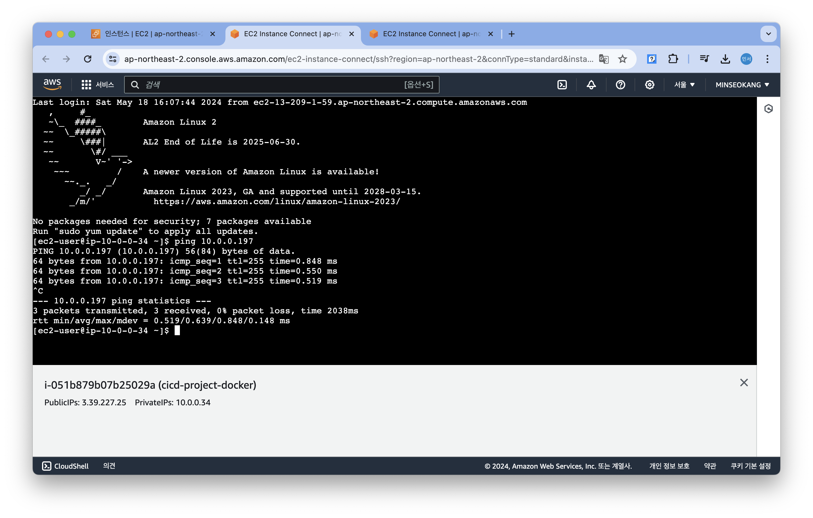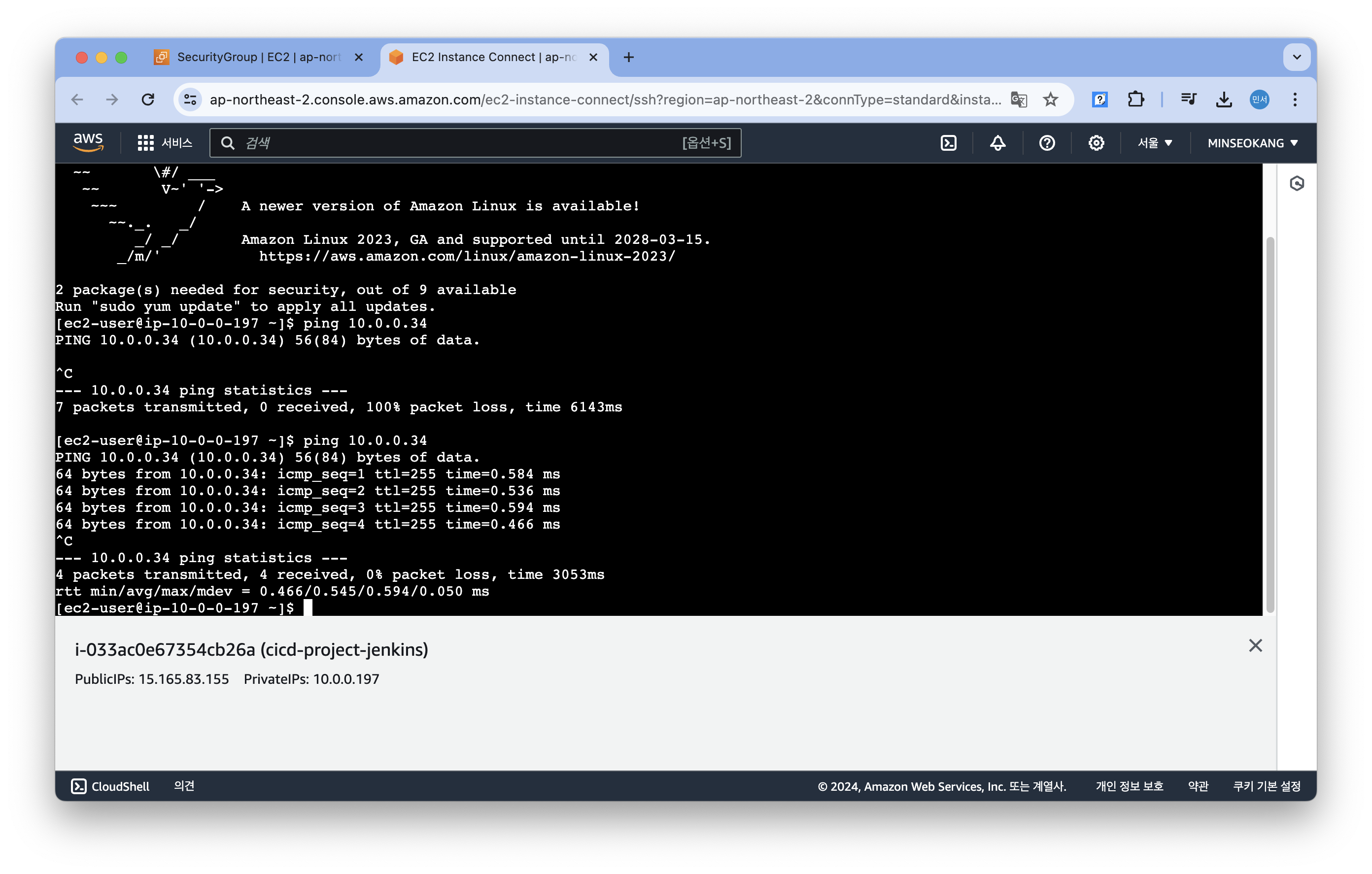 docker 서버로 사용할 EC2에서 jenkins 서버로 사용할 EC2로도 ping이 잘 가는 것을 확인할 수 있다.