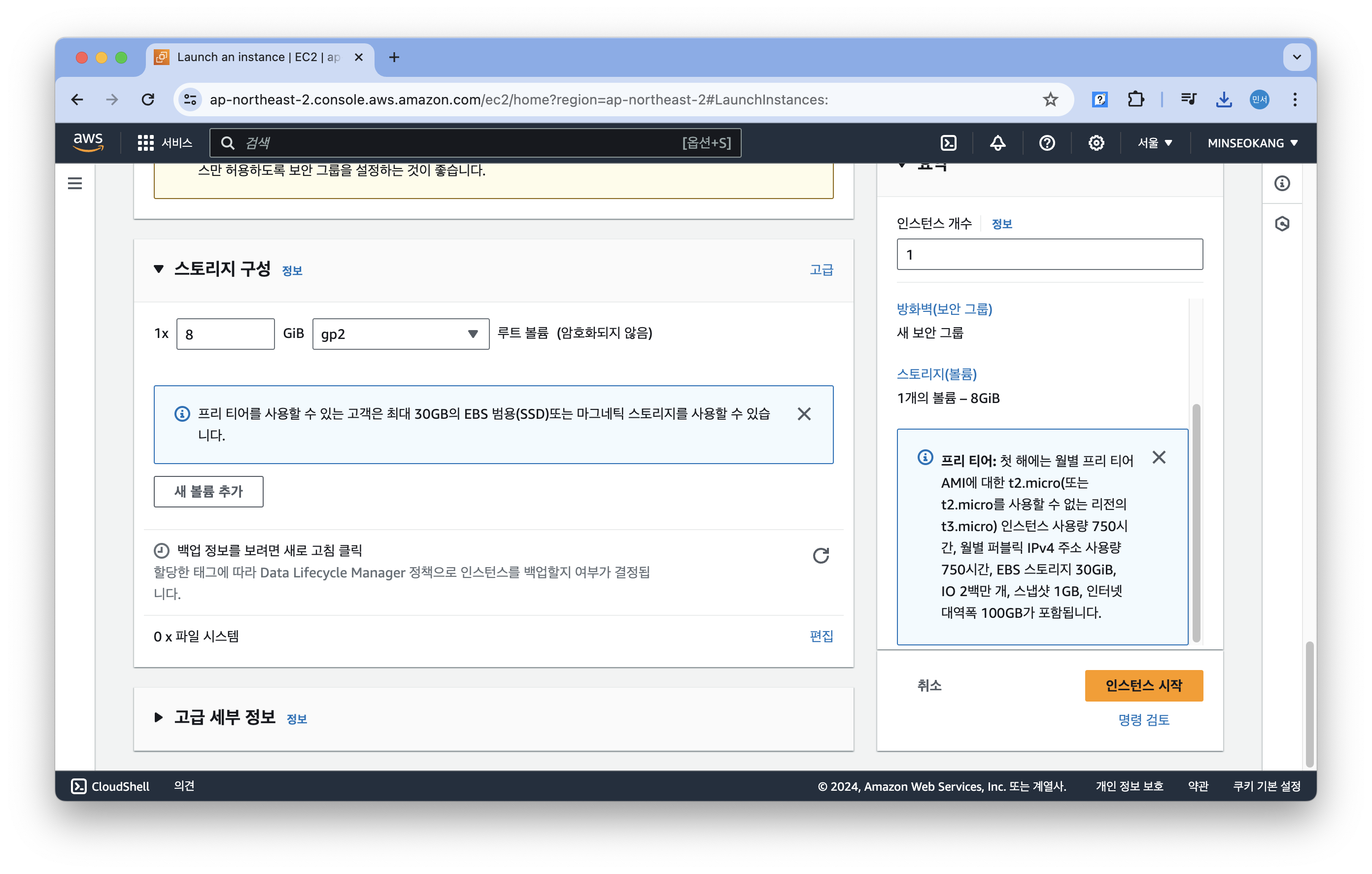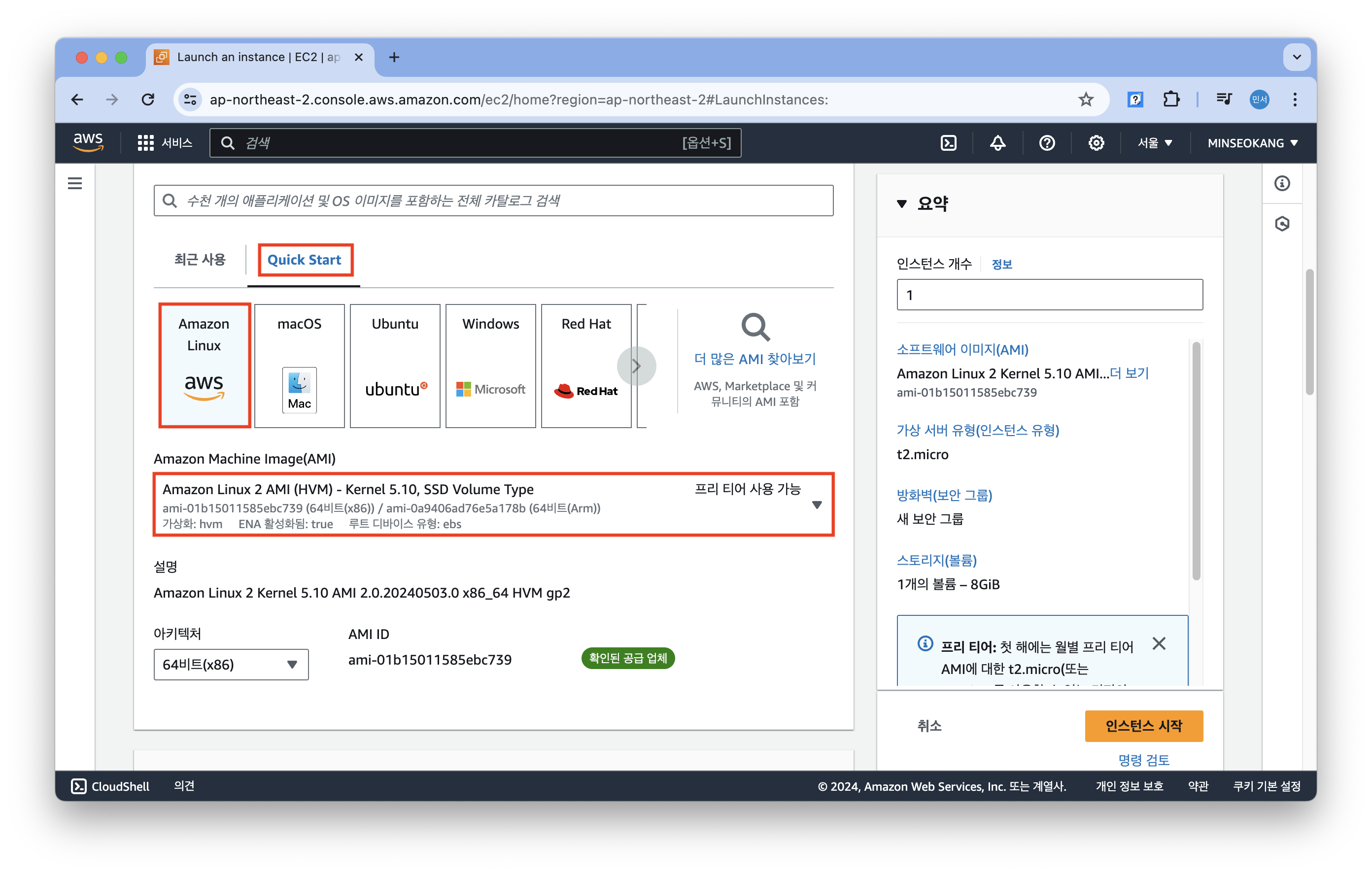 - OS 이미지 : Quick Start - Amazon Linux 2 AMI (HVM) - Kernel 5.10, SSD Volumne Type (프리티어 사용 가능)