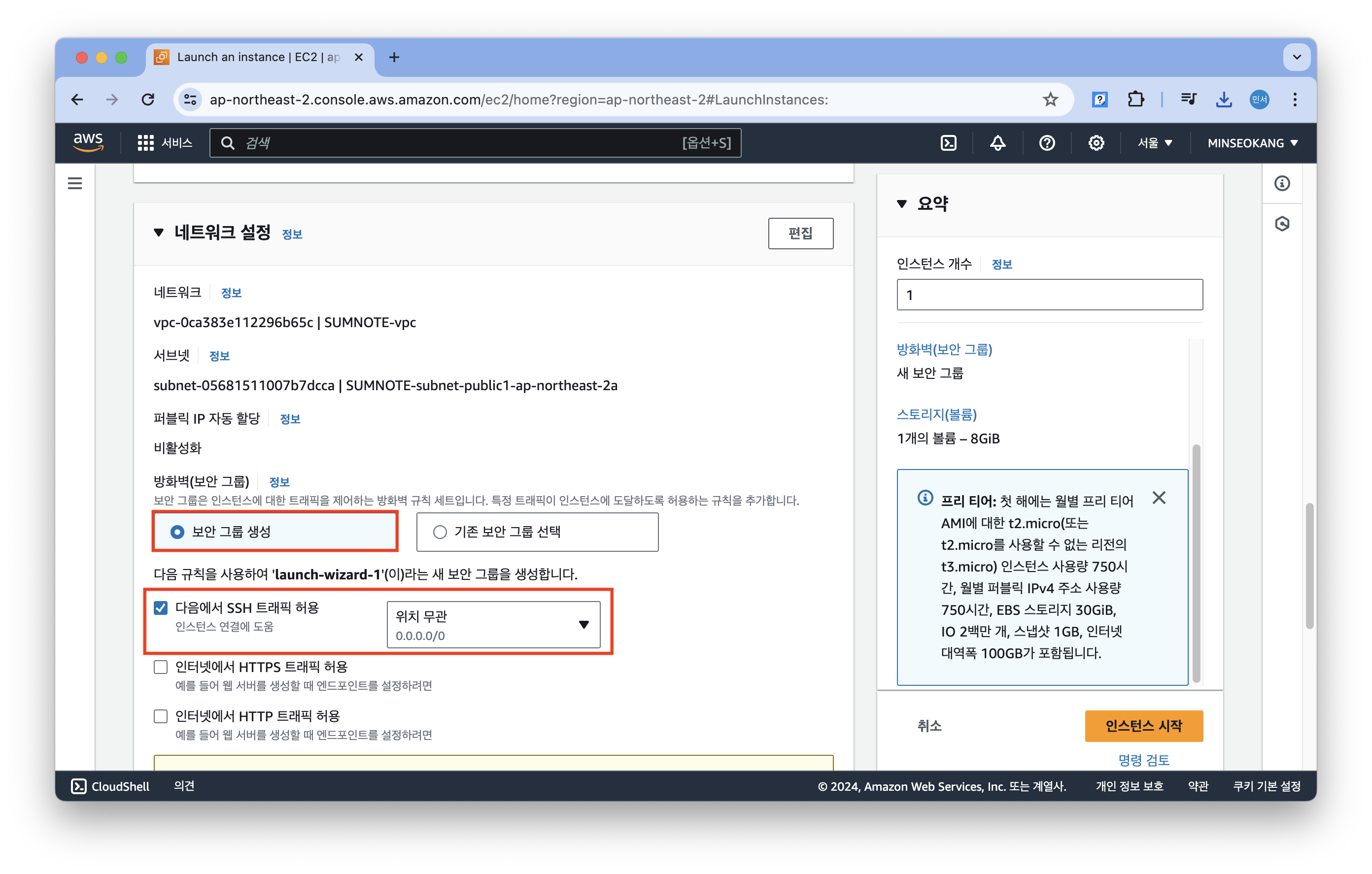 - 다음에서 SSH 트래픽 허용 : 0.0.0.0/0