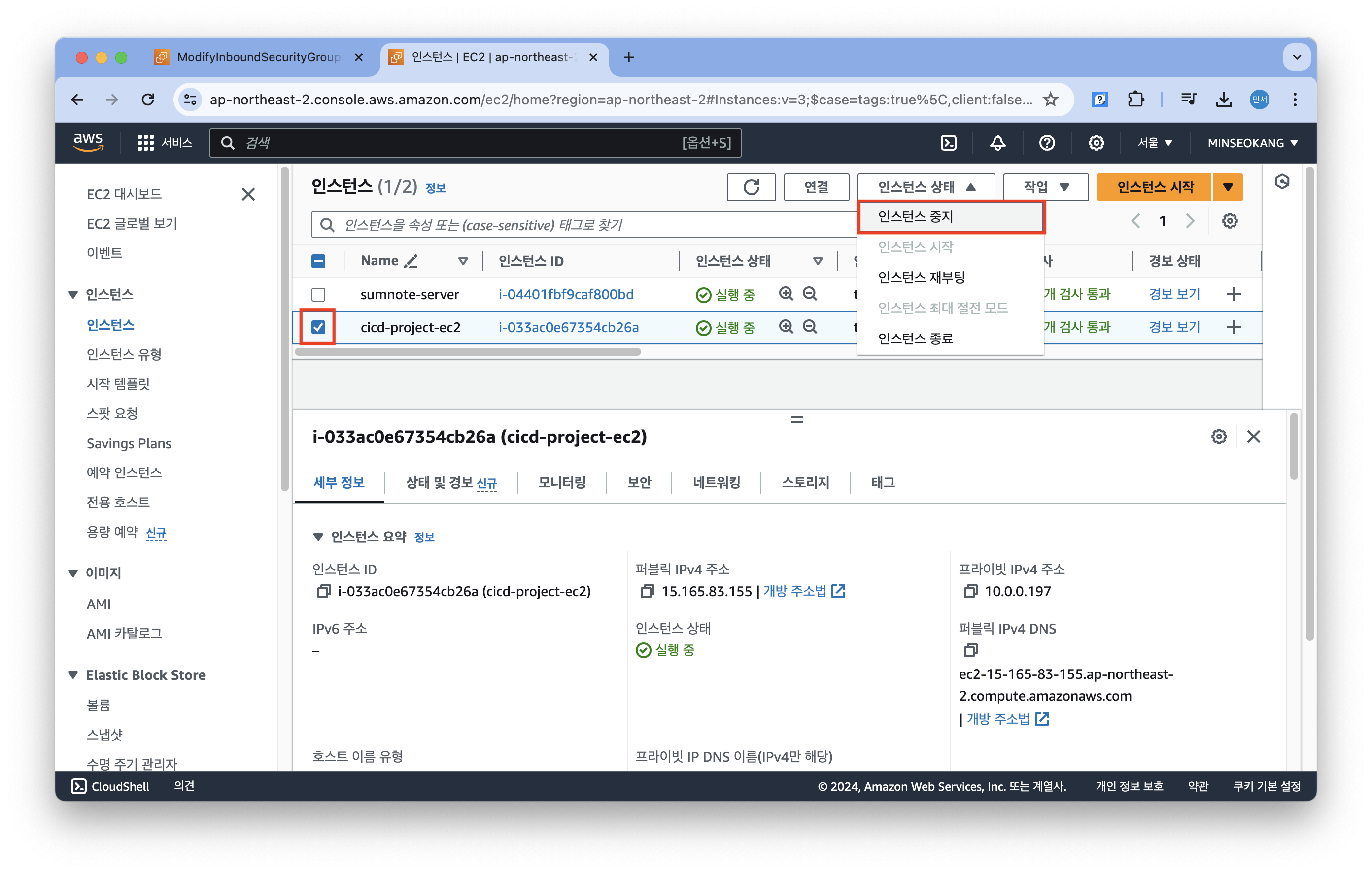 먼저 방금 생성한 인스턴스를 중지시킨다.