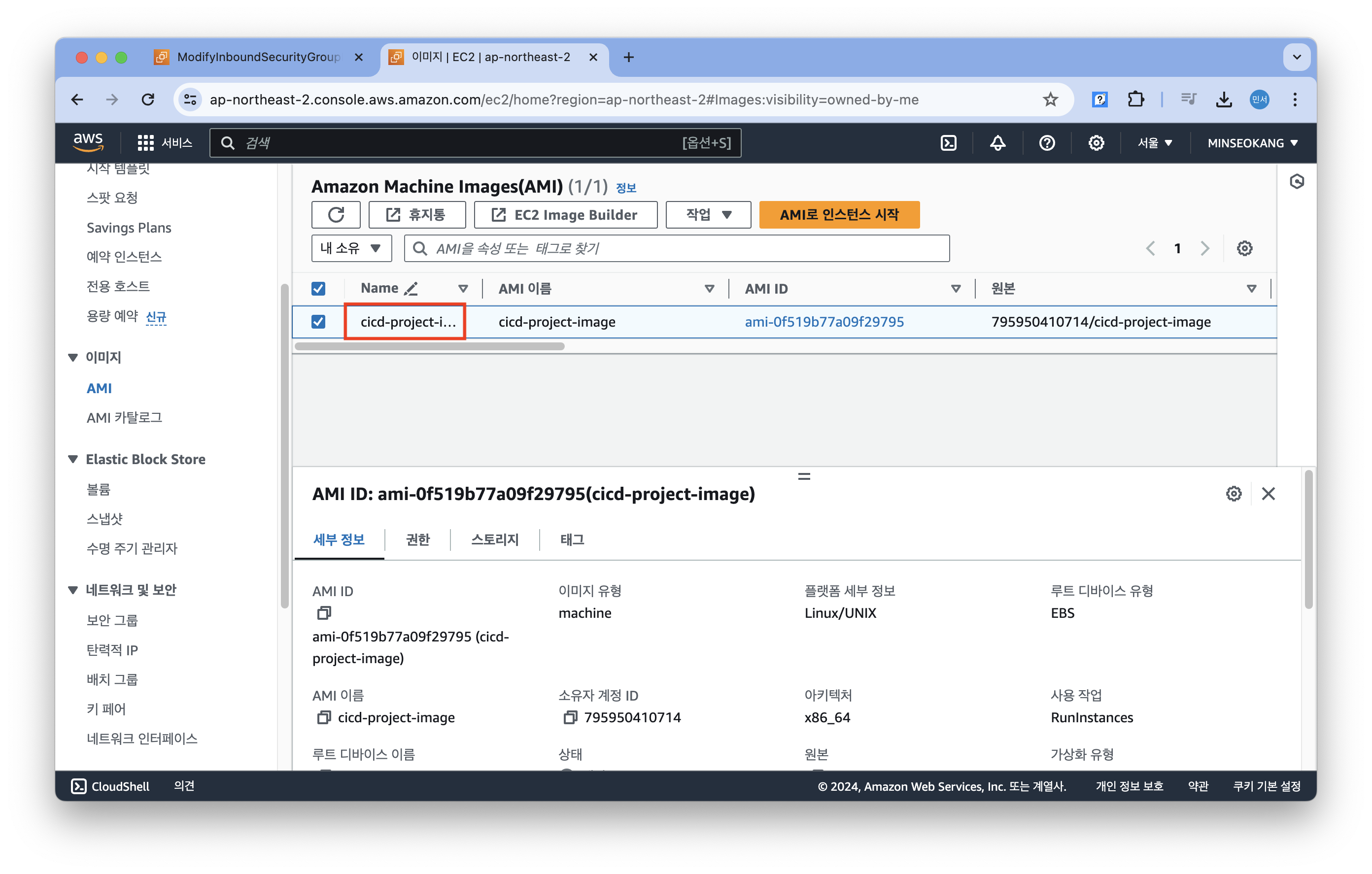 이후 AMI 탭에 들어와서 AMI가 잘 생성된 것을 확인한다. 그리고 Name이 비어있는 것을 볼 수 있는데, cicd-project-image로 지정해준다.
