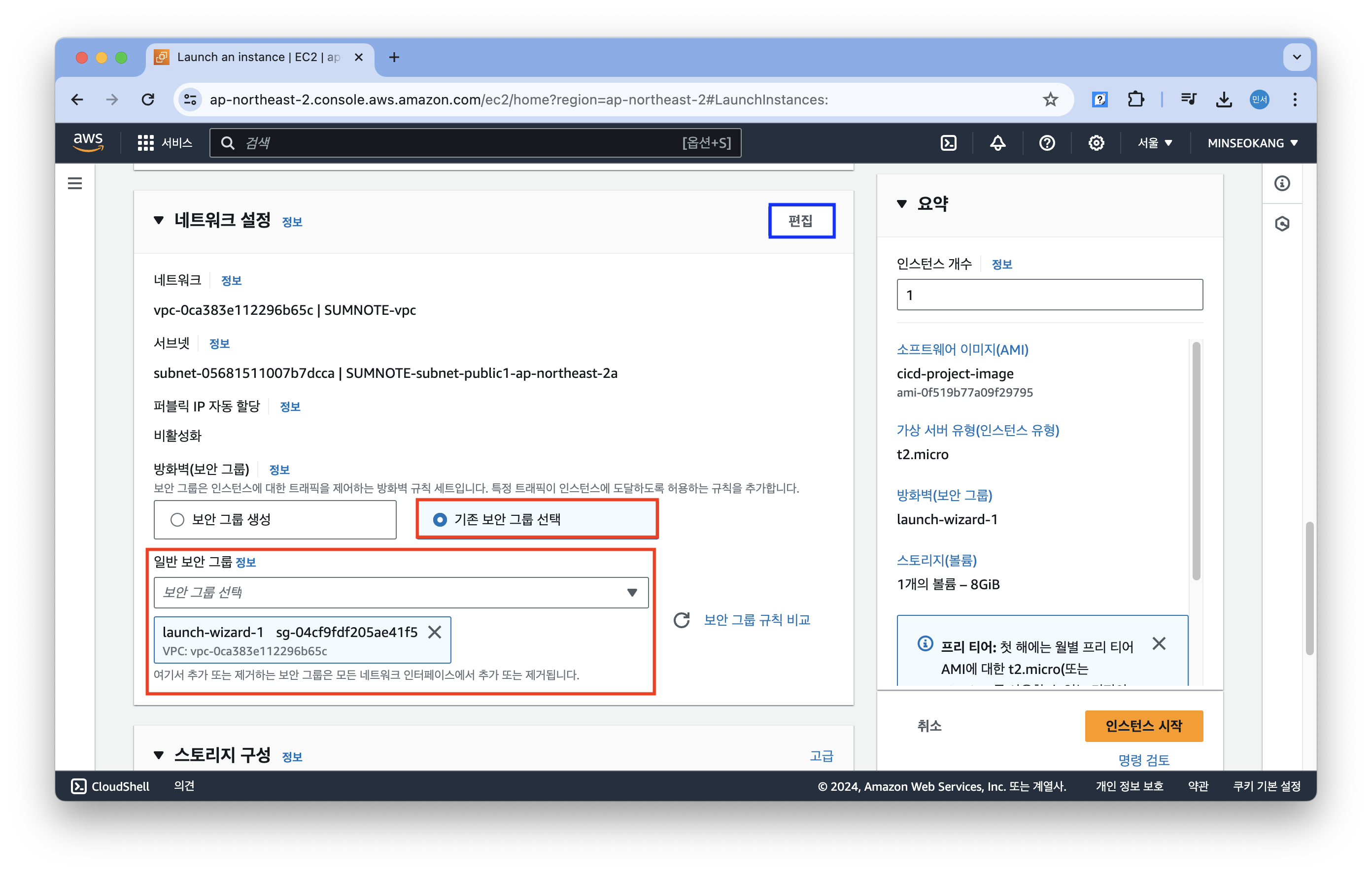 네트워크 설정 부분에서는, 기존 보안 그룹 선택을 클릭하고 cicd-project-jenkins EC2 인스턴스와 연결된 것과 동일한 보안 그룹을 선택한다. 그리고 파란색으로 표시한 편집 버튼을 클릭한다.