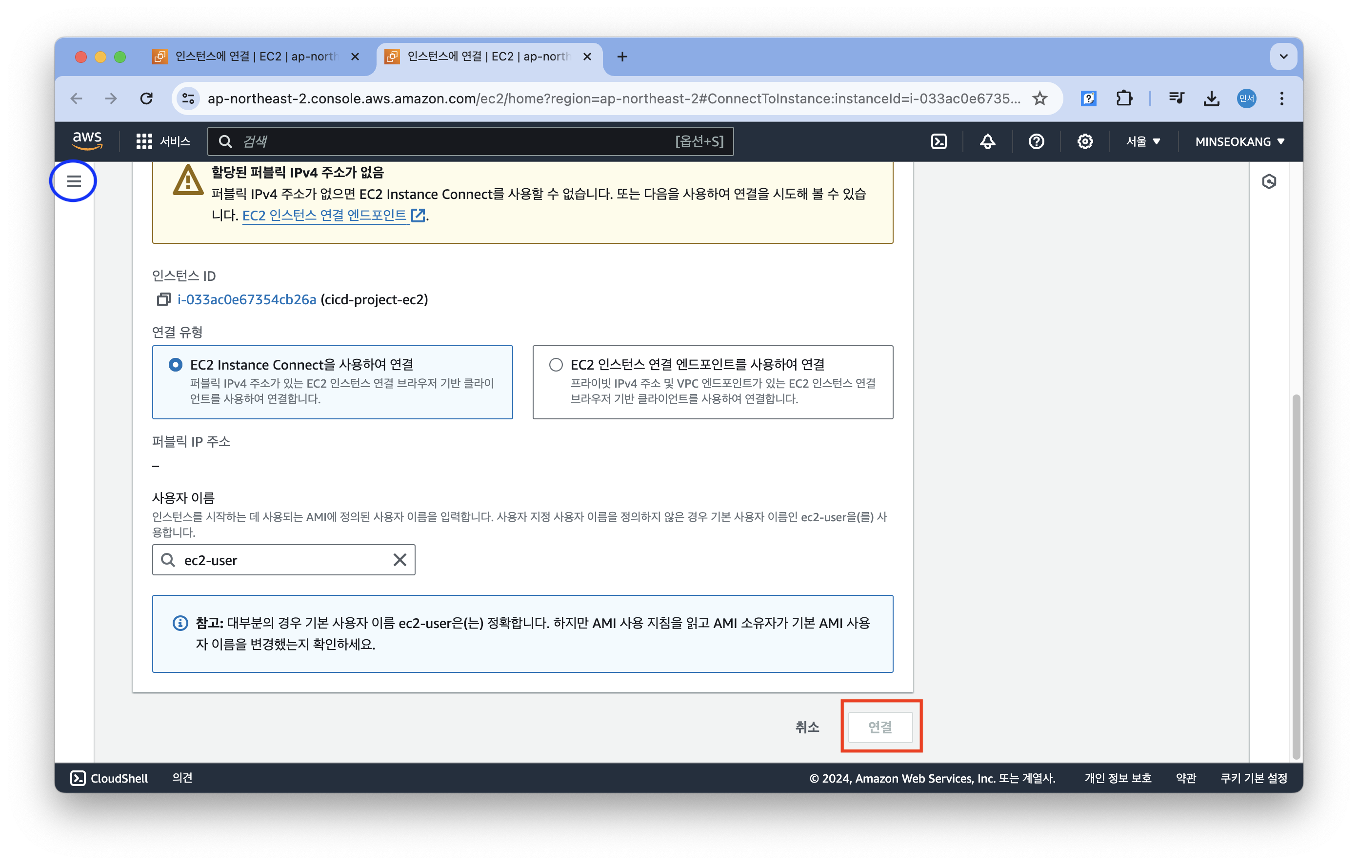 다시 EC2 탭으로 와서 다시 인스턴스 연결을 해보면 이제 연결 버튼이 활성화 된 것을 볼 수 있다. 사용자 이름은 ec2-user로 하고 연결을 해보자.