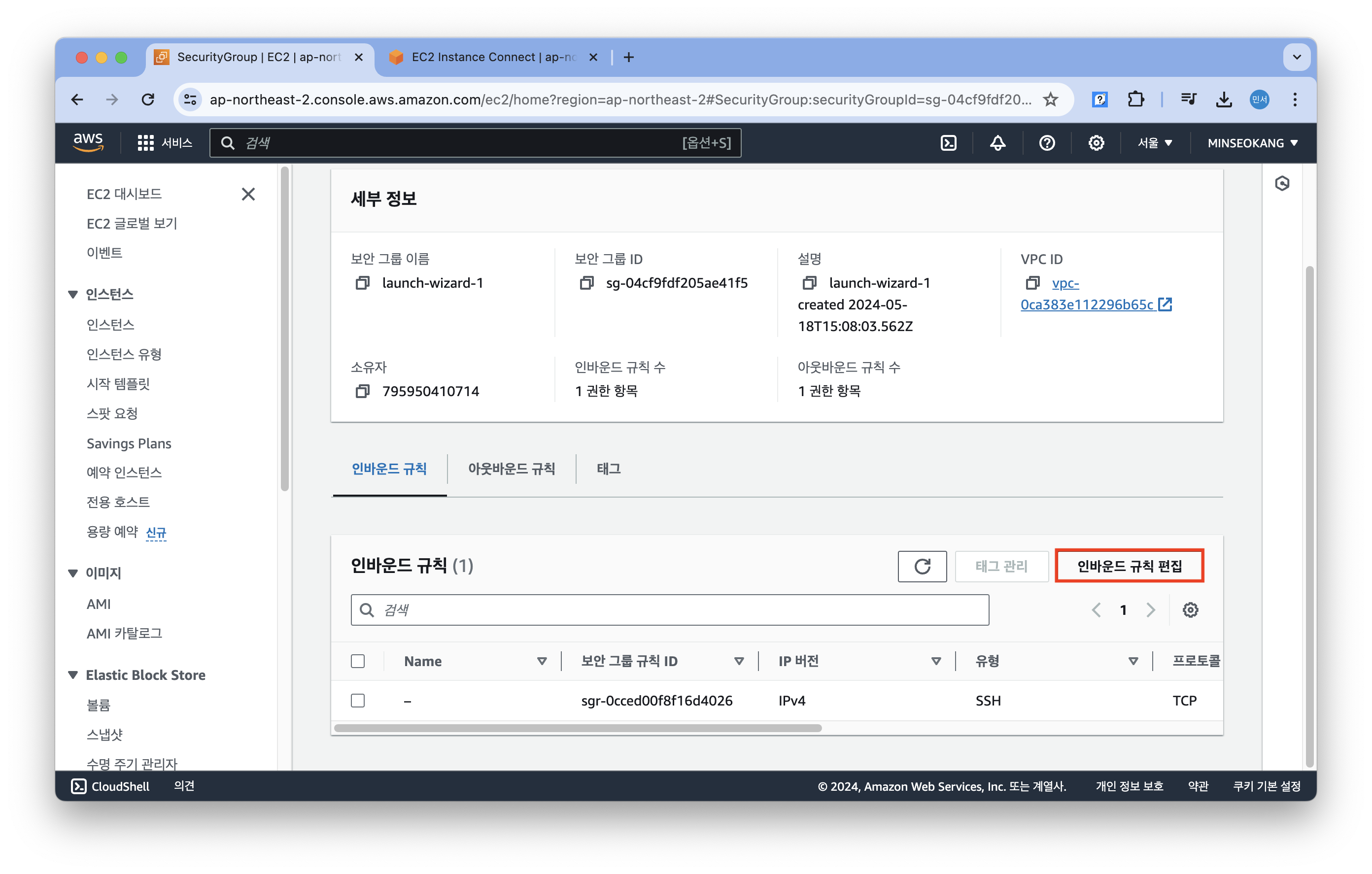 보안 - 보안그룹 - 해당 보안 그룹으로 들어가서
