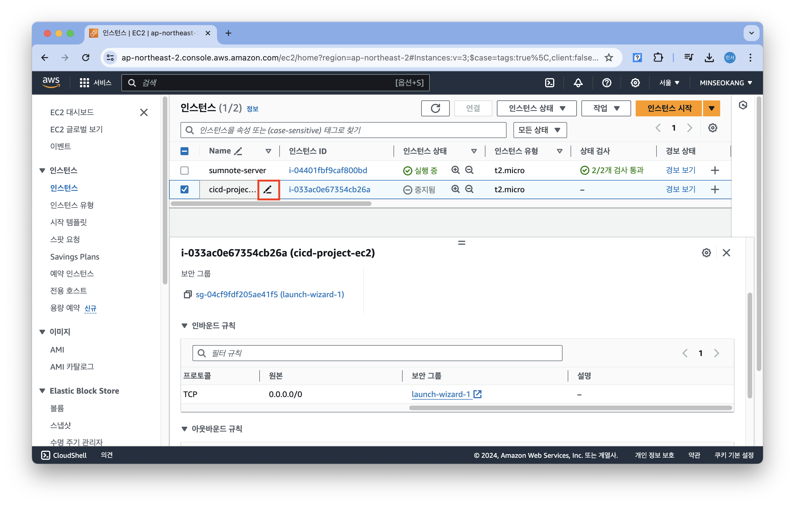 - 인스턴스 이름 : cicd-project-ec2 (추후에 변경 가능)