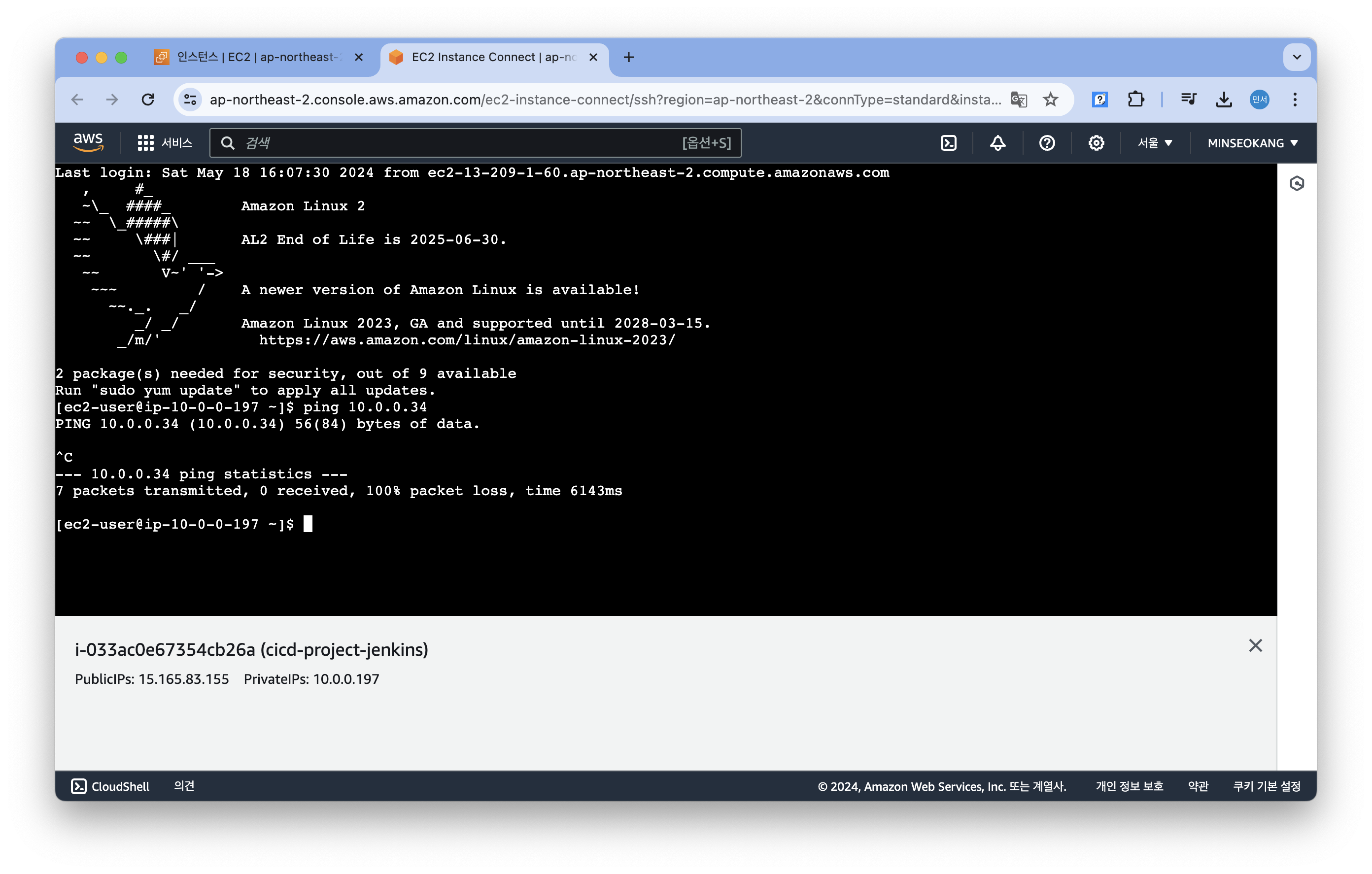 docker 서버로 사용할 EC2에서 jenkins 서버로 사용할 EC2로도 ping이 잘 가는 것을 확인할 수 있다.