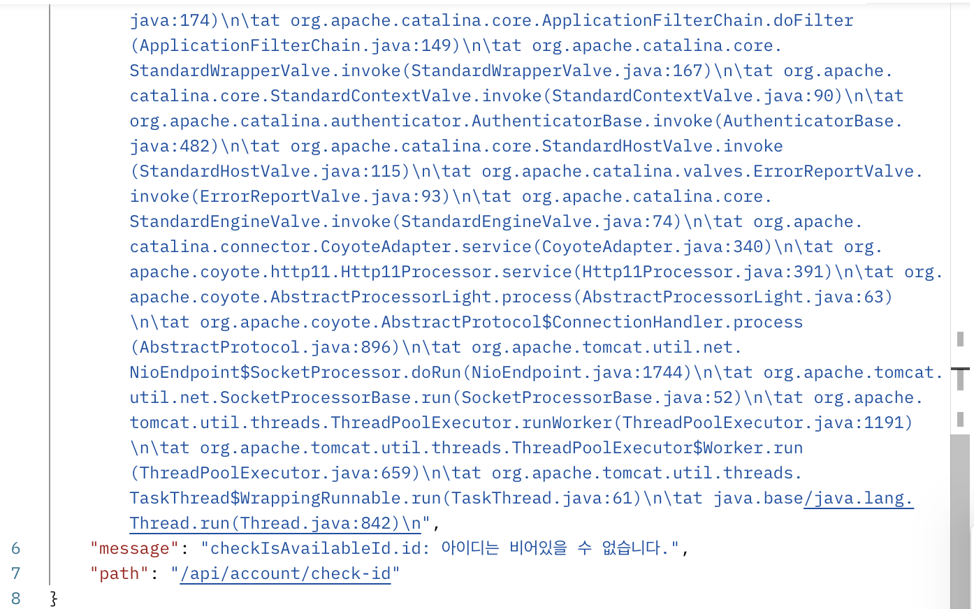 위 상태에서 api/account/check-id?id= 로 요청을 보내면 아래와 같은 응답을 받는다.
