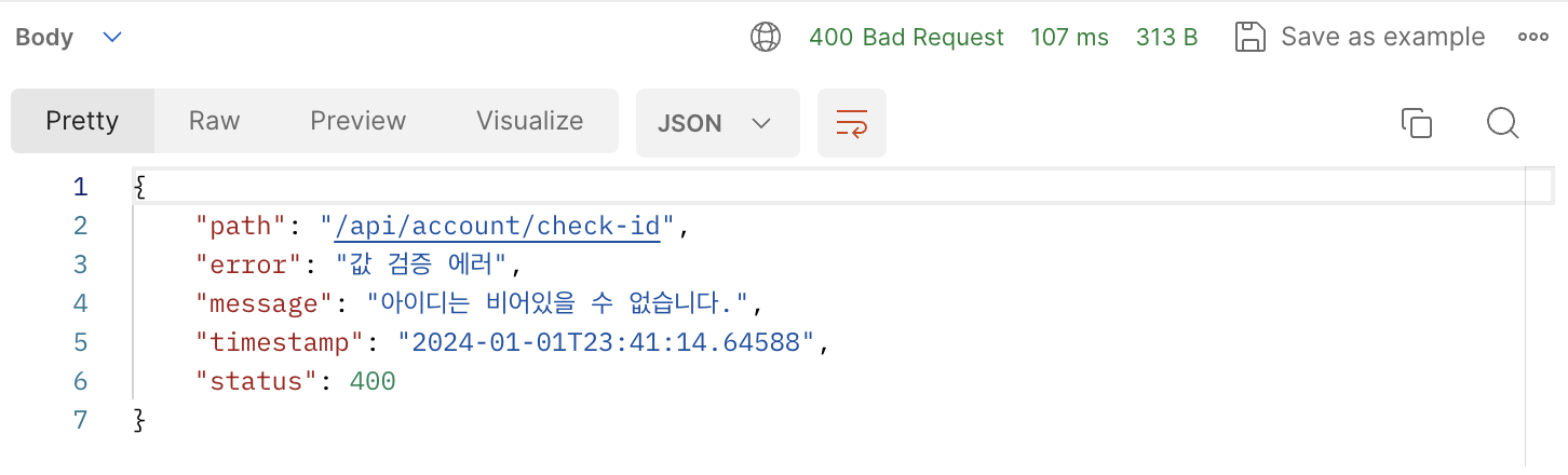 하지만 프론트에서 받은 값이 빈 값이면 불린 값을 리턴하는 것이 아닌, 오류 메시지를 리턴하고자 한다. 즉, 요청 경로가 api/account/check-id?id= 인 경우에 오류 메시지를 리턴한다.