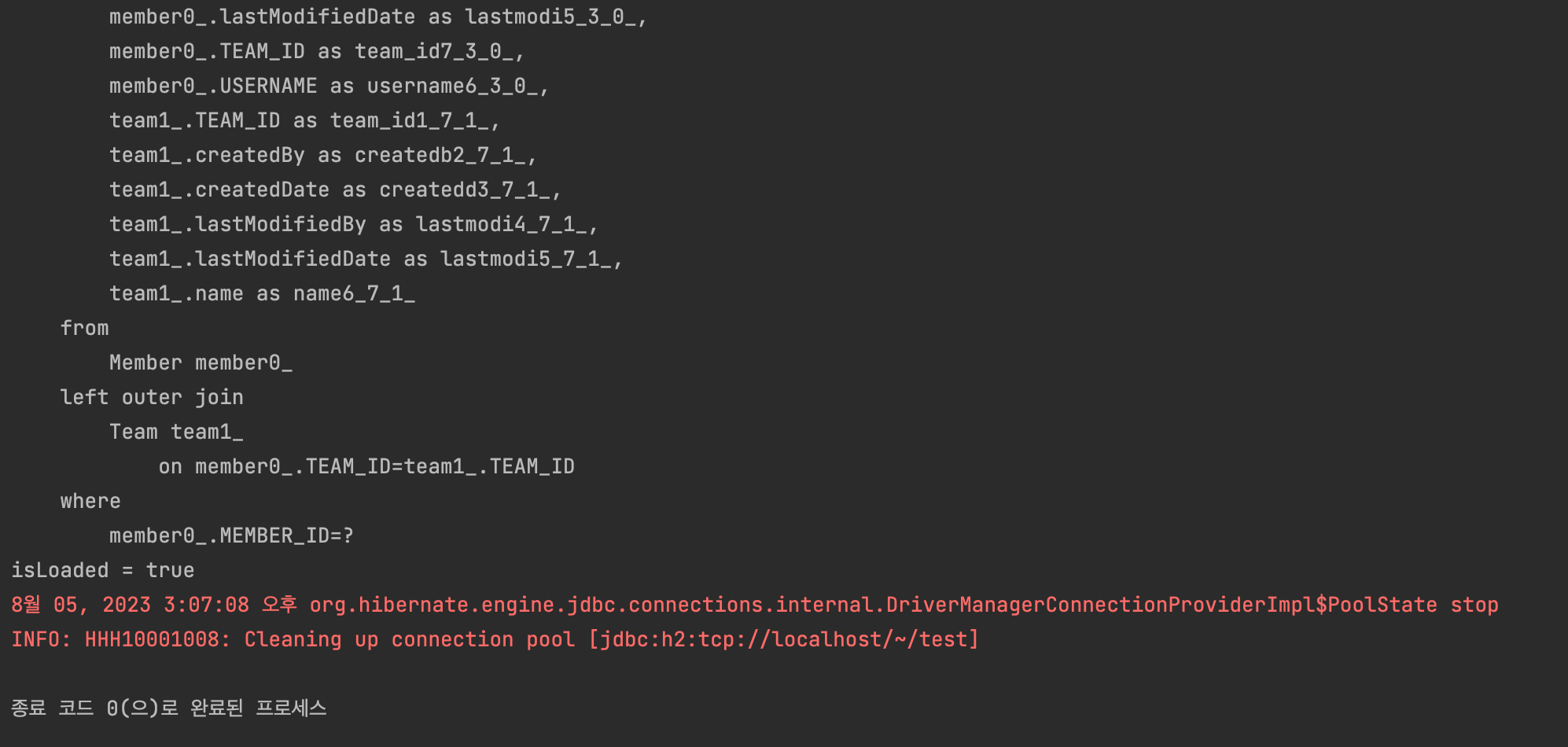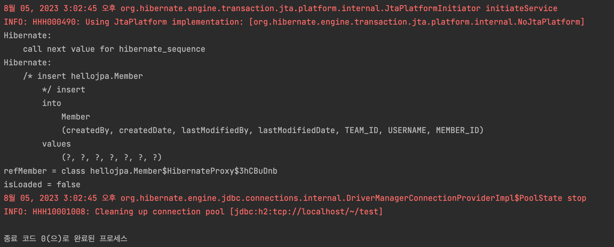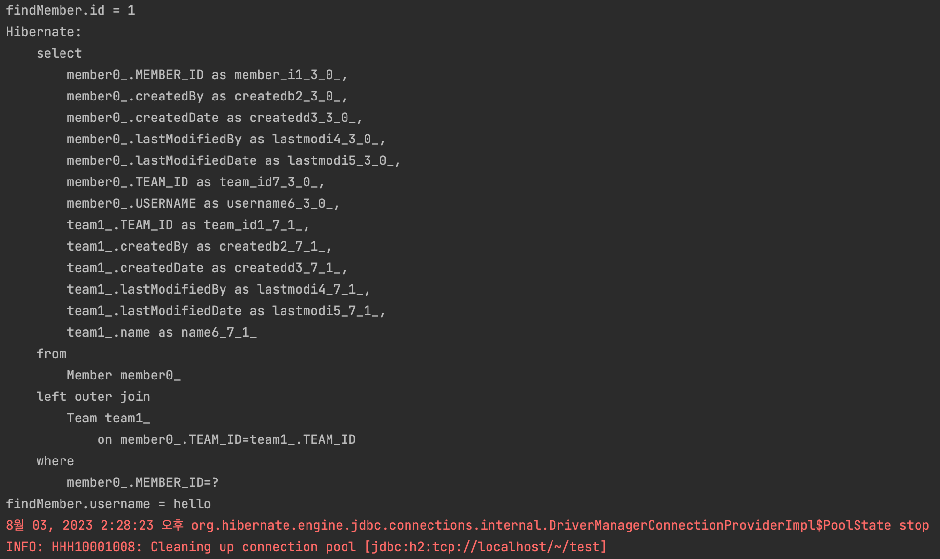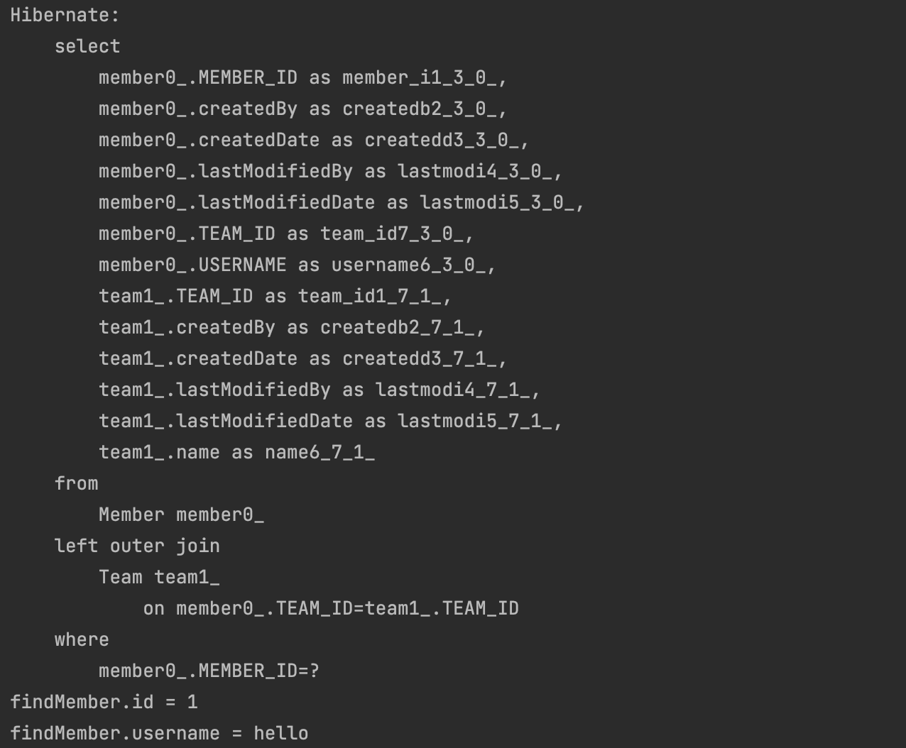먼저, sout 두 줄을 주석처리 하고 실행하면 select 쿼리가 안나간다. 하지만 sout의 주석을 풀고 실행하면 select 쿼리가 나가고 sout의 결과도 출력된다. 조금 더 자세히 보면, id를 찾을 때는 select 쿼리가 안나간다. 왜냐하면 id를 찾을 때 파라미터로 member.getId()를 직접 넣었기 때문에 DB에 접근하지 않아도 알 수 있다. 하지만 username을 출력할 때는 findMember.getUsername()에 접근하는 순간 DB에 쿼리를 보낸다.
