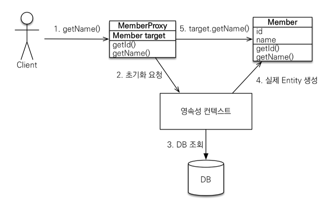 프록시 객체인 member를 가져와 getName을 호출하면 target에 값이 없음을 확인하고 JPA가 영속성 컨텍스트에 요청하여 영속성 컨텍스트가 DB를 조회하고 실제 Entity 객체를 생성하여 target에 진짜 객체와 연결해준다.