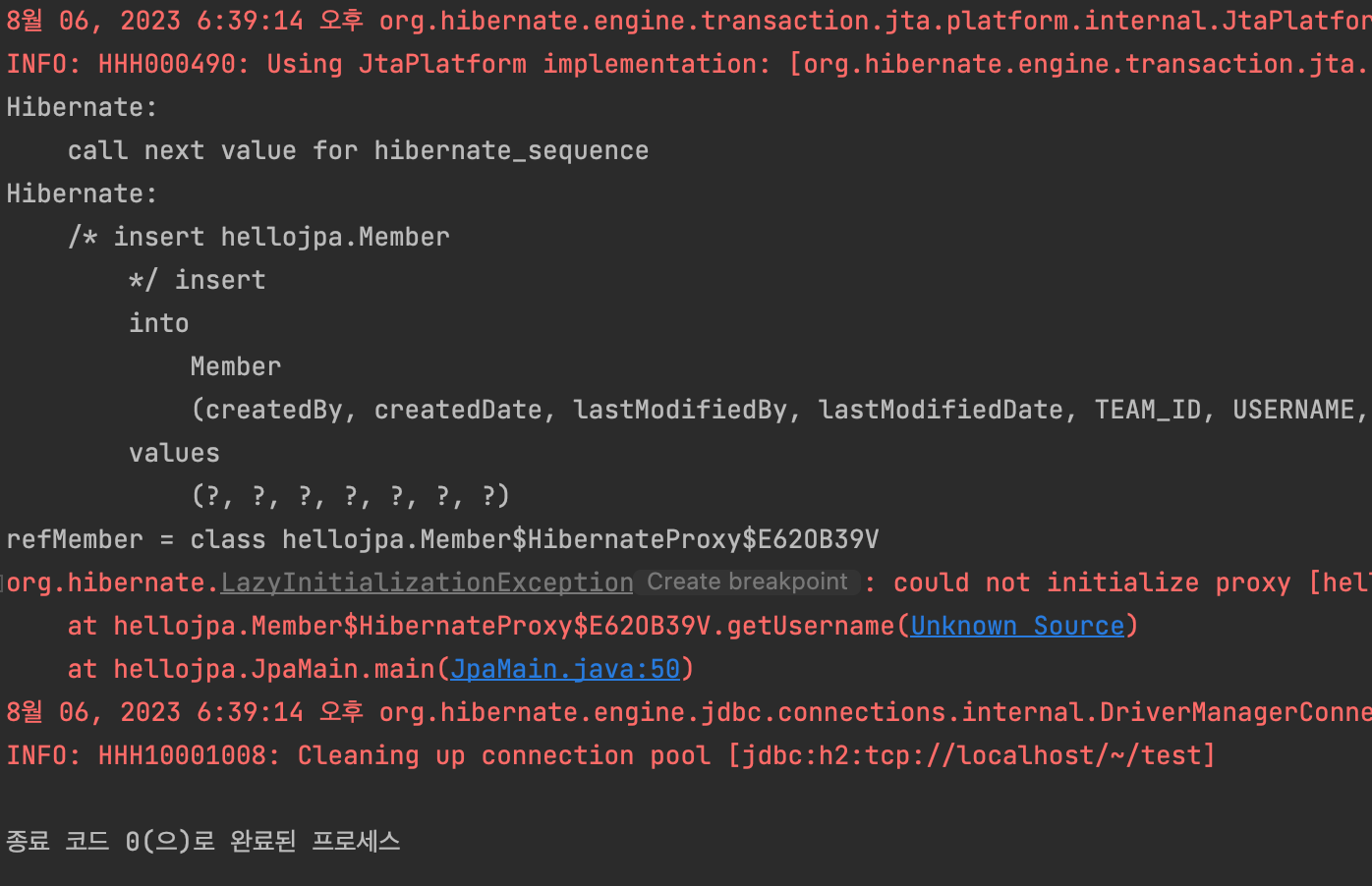 5. 영속성 컨텍스트의 도움을 받을 수 없는 준영속 상태일 때, 프록시를 초기화하면 문제가 발생한다. (하이버네이트는 org.hibernate.LazyInitializationException 이라는 초기화를 할 수 없다는 예외를 터트린다.) 다음은 관련 코드이다.