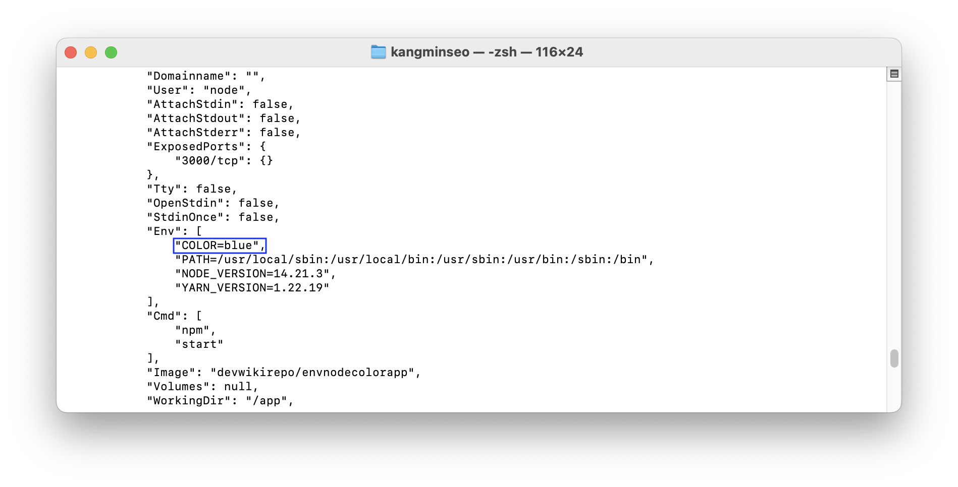 docker image inspect devwikirepo/envnodecolorapp 으로 이미지의 메타데이터를 확인해 본다.