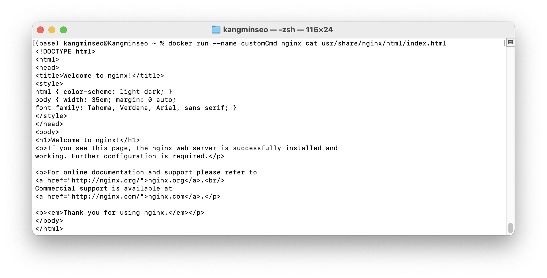 docker run --name customCmd nginx cat usr/share/nginx/html/index.html 명령어로 Cmd를 덮어씌운 customCmd 컨테이너를 생성하고 실행한다. 그럼 해당 경로의 파일 내용이 출력되는 것을 볼 수 있다.