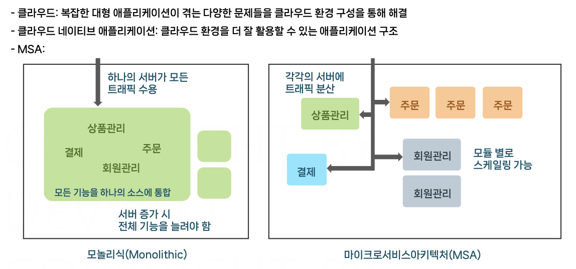 예전에는 모든 기능을 하나의 애플리케이션에 구성했는데, 이런 전통적인 방식을 모놀리식 방식이라고 한다. 하나의 애플리케이션의 크기가 커지기 때문에 애플리케이션을 실행하는데 시간이 오래 걸린다. 트래픽이 증가할 때는 트래픽을 받을 수 있는 서버를 증가시켜야 하는데, 서버 실행시간이 길어지면 트래픽에 대처할 수 있는 능력도 떨어지게 된다. 하나의 애플리케이션의 크기가 클수록 개발에 소요되는 빌드 시간이나 배포 시간이 오래 걸린다.