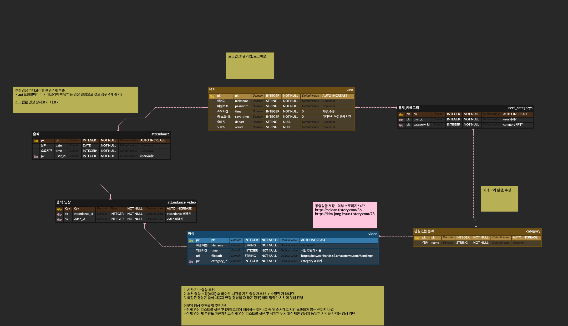 DB 설계는 다음과 같이 했고 (개발하면서 일부 수정된 부분이 있을 수 있는데 반영이 안되어 있을 수도..?)