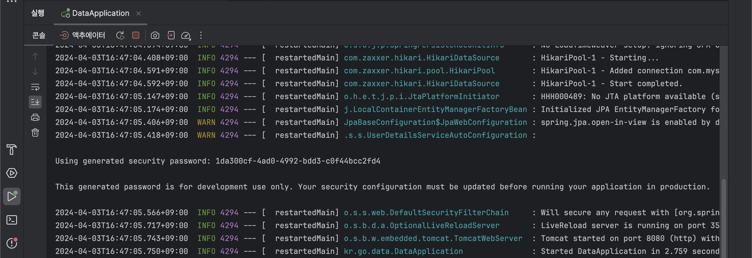 여기까지 작성하고 실행을 하면 로그에 Using generated security password, This generated 어쩌구~ 뜨는데, security가 잘 동작하고 있다는 것을 알 수 있다.
