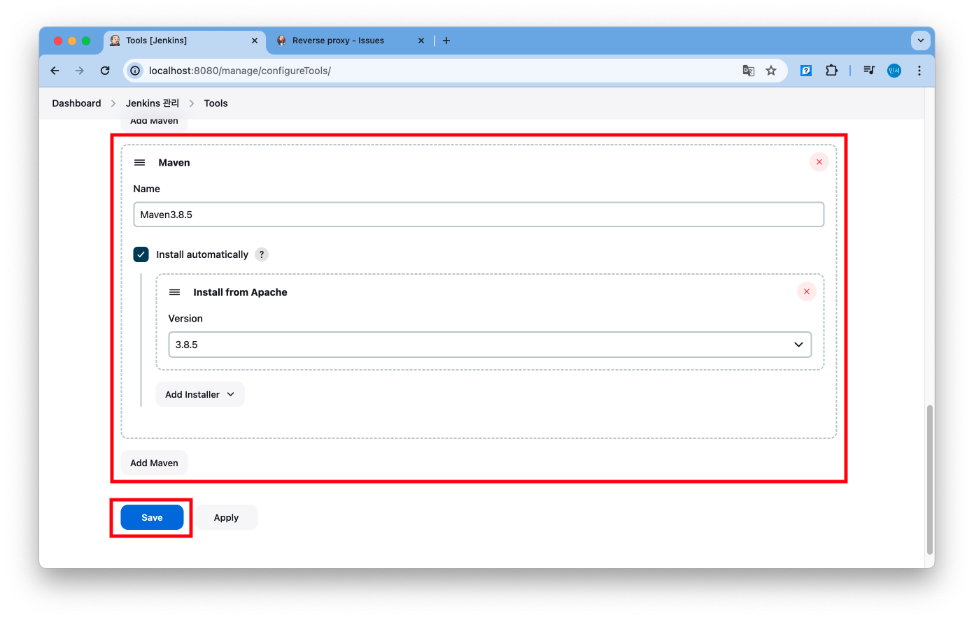 [Jenkins 관리] - [Tools] 에서 밑으로 내려오면, Maven Installation가 보인다. Add Maven 버튼을 클릭하고, 이름, 버전을 선택하고 Install automatically에 체크를 하고 Save를 누른다.