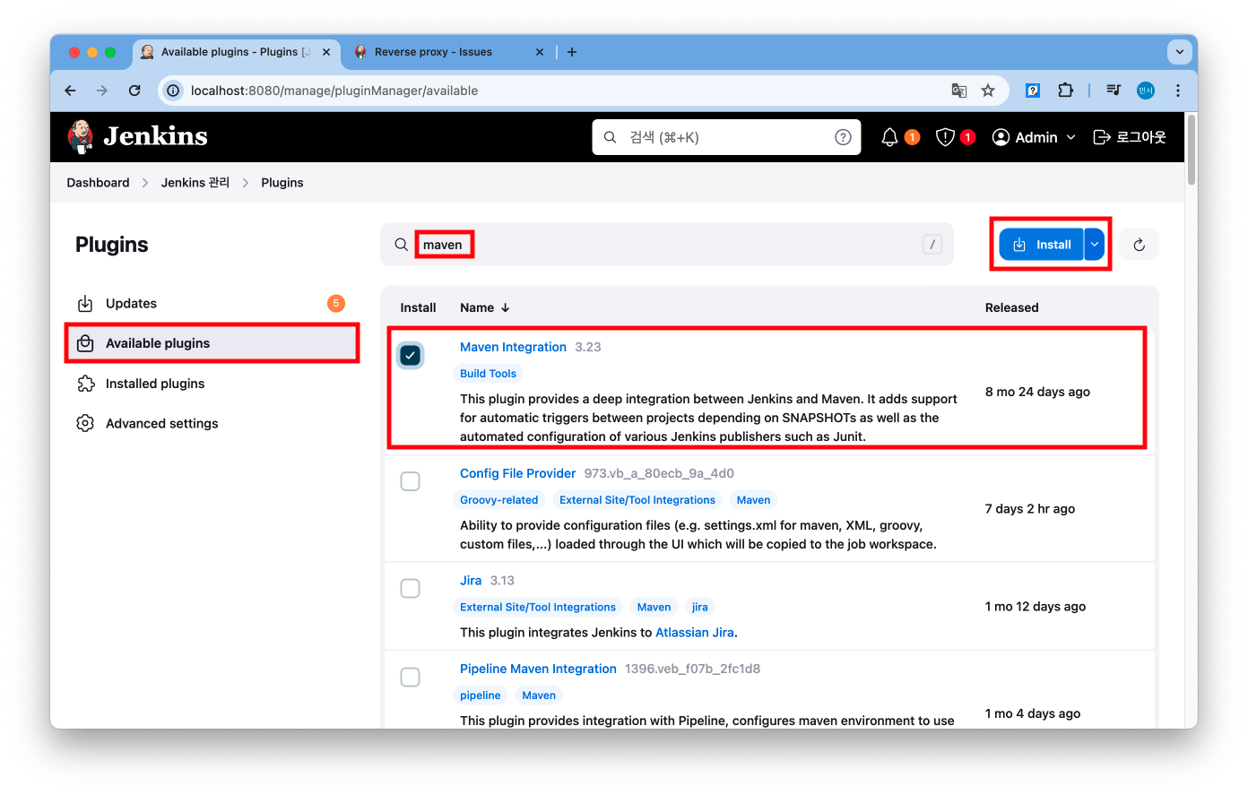 [Jenkins 관리] - [Plugins] - [Available plugins] 에서 maven을 검색한다.