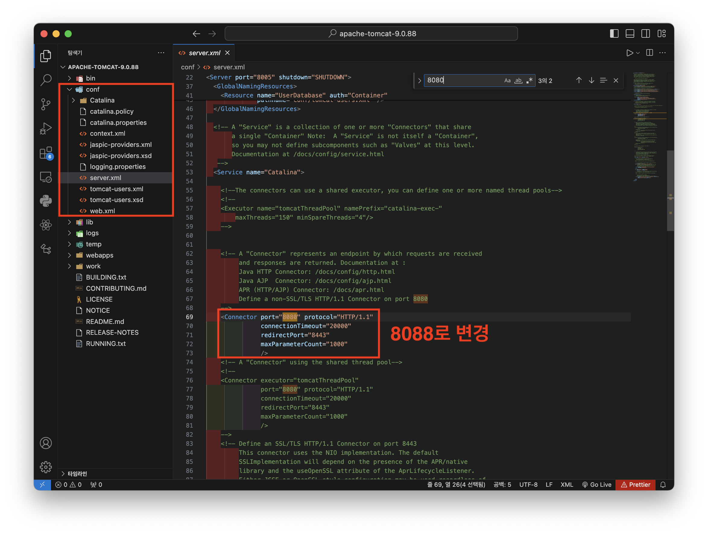 conf/server.xml 을 열어서 Tomcat 서버의 실행 포트번호를 8088로 변경한다.