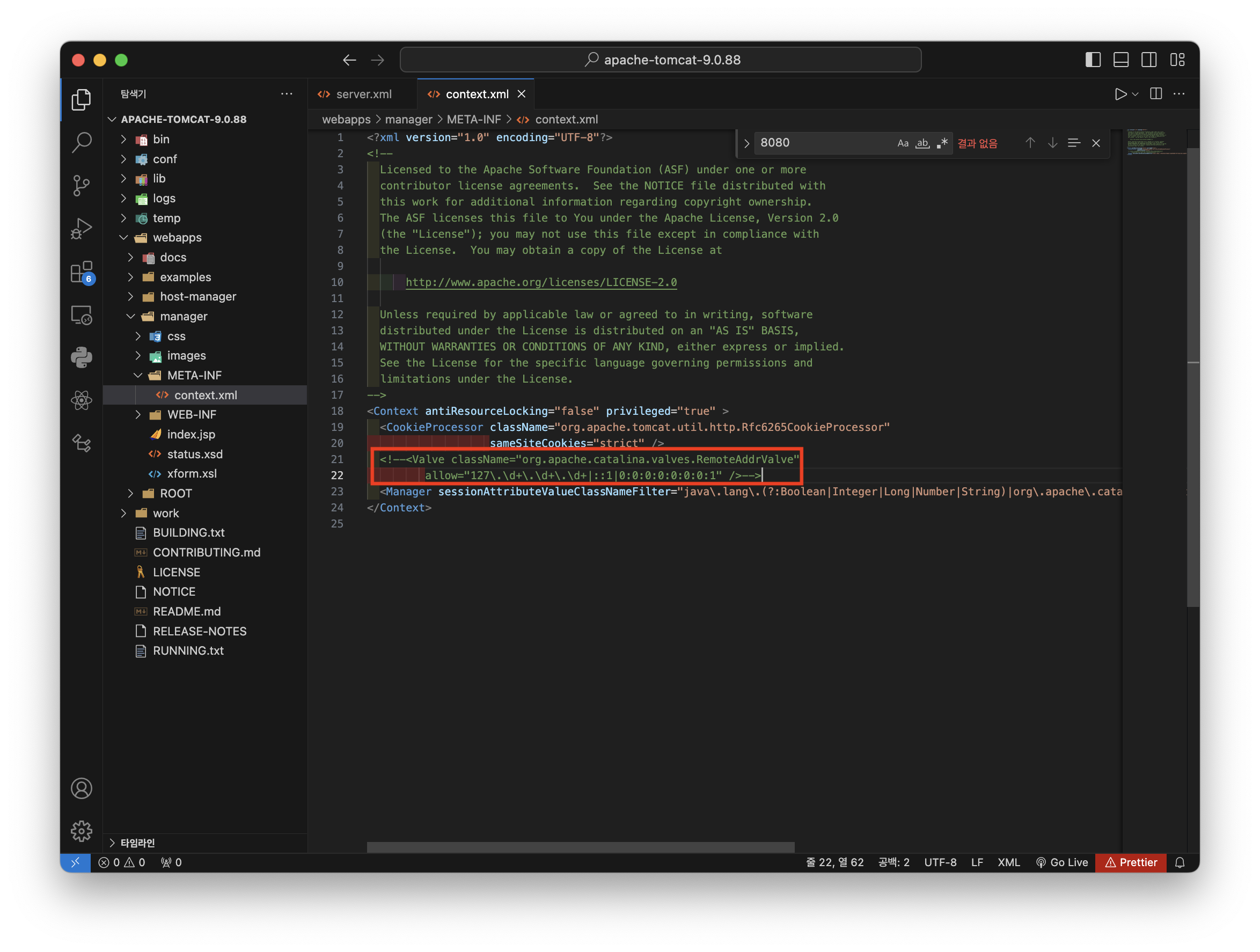 다운받았던 apache-tomcat-9.0.88 폴더를 vscode에서 연다.