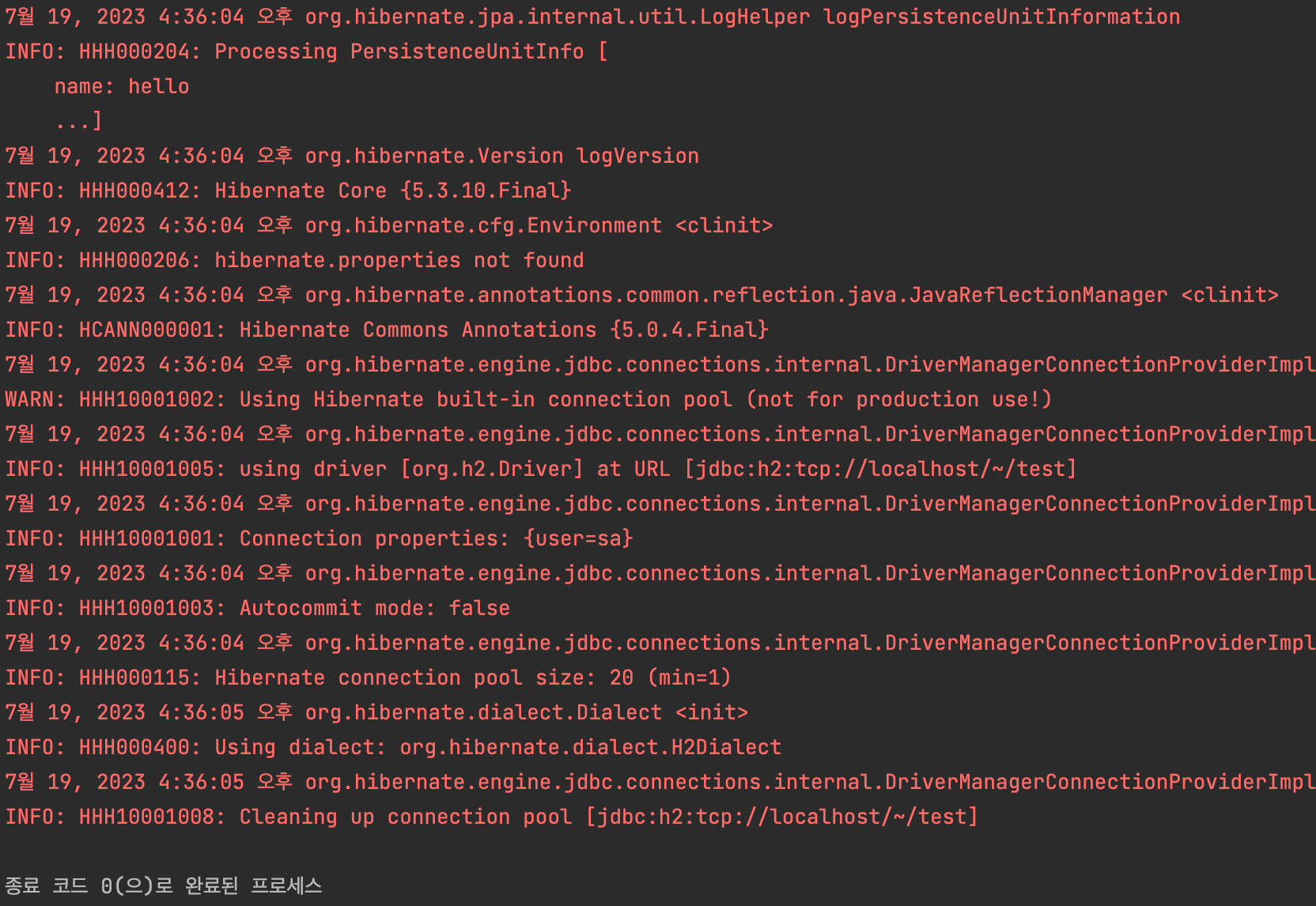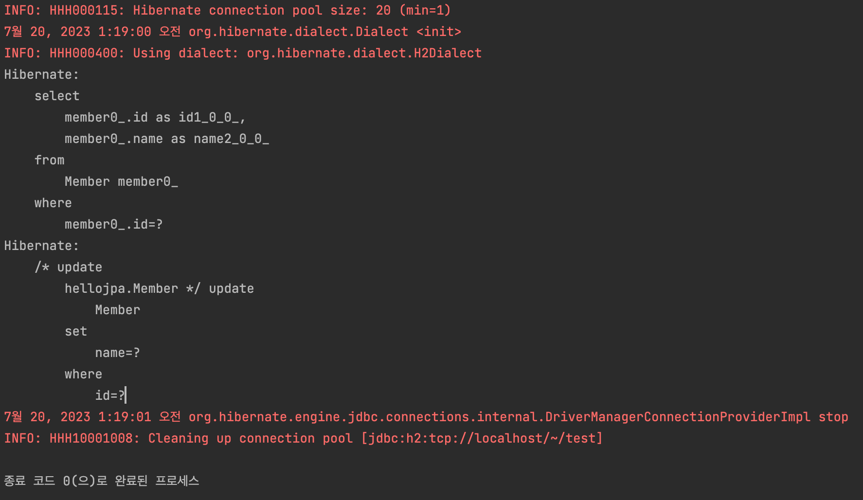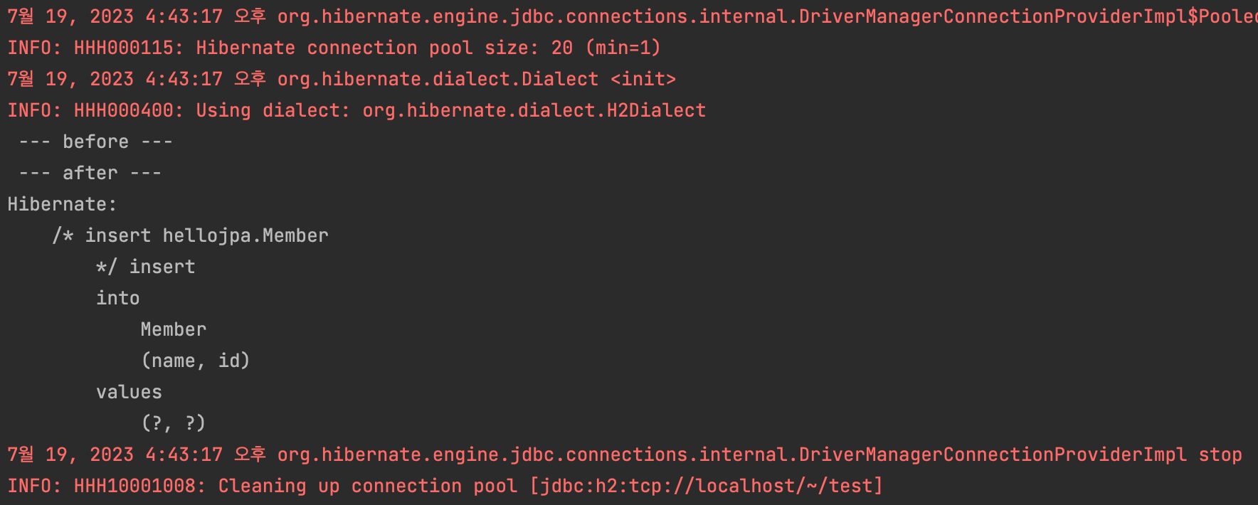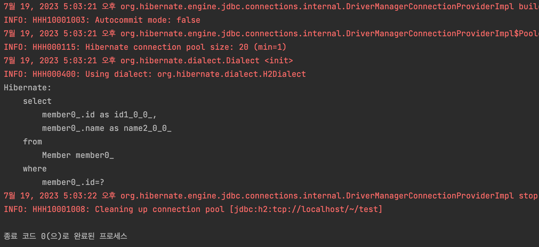 - persist 할 때, 쿼리문을 DB에 보내는게 아니라, 커밋하는 순간 DB에 쿼리문을 보낸다. 실행 로그를 보면 구분선 이후에 쿼리문이 나타나는 것을 볼 수 있다.